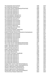 Tilia platyphyllos (Sommerlinde) 1900 2019 Acer platanoides (Spitzahorn) 1902 2021 Tilia cordata 'Rancho' (Kleinblättrige Winterlinde) 2009 2021 Acer platanoides (Spitzahorn) 1902 2025 Acer platanoides (Spitzahorn) 1940 2019 Acer platanoides (Spitzahorn) 1940 2022 Acer platanoides (Spitzahorn) 1940 2019 Acer pseudoplatanus (Bergahorn) 1909 2019 Acer pseudoplatanus (Bergahorn) 1940 2022 Tilia platyphyllos (Sommerlinde) 1863 2019 Acer platanoides (Spitzahorn) 1917 2019 Tilia platyphyllos (Sommerlinde) 1940 2024 Tilia platyphyllos (Sommerlinde) 1940 2024 Tilia platyphyllos (Sommerlinde) 1940 2019 Tilia platyphyllos (Sommerlinde) 1940 2020 Tilia tomentosa (Silberlinde) 1881 2024 Tilia platyphyllos (Sommerlinde) 1842 2025 Tilia cordata (Winterlinde) 1940 2019 Tilia tomentosa 'Brabant' (Silberlinde) 2020 2021 Tilia platyphyllos (Sommerlinde) 1940 2021 Platanus orientalis 'Minaret' (Orientalische Säulenplatane) 2004 2021 Tilia platyphyllos (Sommerlinde) 1831 2019 Tilia platyphyllos (Sommerlinde) 1863 2021 Tilia platyphyllos (Sommerlinde) 1862 2022 Tilia platyphyllos (Sommerlinde) 1887 2021 Acer platanoides (Spitzahorn) 1930 2023 Acer platanoides (Spitzahorn) 1930 2019 Acer platanoides (Spitzahorn) 1930 2023 Tilia cordata 'Rancho' (Kleinblättrige Winterlinde) 2011 2019 Tilia cordata 'Rancho' (Kleinblättrige Winterlinde) 2011 2024 Juglans regia (Walnussbaum) 1957 2024 Juglans regia (Walnussbaum) 1947 2024 Acer platanoides (Spitzahorn) 1940 2019 Juglans regia (Walnussbaum) 1957 2024 Acer platanoides (Spitzahorn) 1950 2024 Tilia cordata (Winterlinde) 2008 2024 Tilia cordata 'Greenspire' (Stadtlinde) 2007 2024 Acer platanoides (Spitzahorn) 1940 2020 Acer platanoides (Spitzahorn) 1940 2020 Acer platanoides (Spitzahorn) 1947 2020 Acer platanoides (Spitzahorn) 1940 2022 Acer platanoides (Spitzahorn) 1960 2024 Acer platanoides (Spitzahorn) 1970 2024 Acer platanoides (Spitzahorn) 1970 2022 Ginkgo biloba 'Autumn Gold' (Fächerblattbaum) 2010 2022 Gleditsia triacanthos 'Skyline' (Säulengleditschie) 2013 2022 Aesculus hippocastanum (Rosskastanie) 1990 2019 Gleditsia triacanthos (Lederhülsenbaum) 2013 2019 Aesculus hippocastanum (Rosskastanie) 1990 2021 Ginkgo biloba 'Autumn Gold' (Fächerblattbaum) 2010 2019 Tilia tomentosa 'Brabant' (Silberlinde) 2023 2024