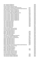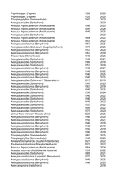 Populus spec. (Pappel) 1980 2020 Populus spec. (Pappel) 1920 2020 Tilia platyphyllos (Sommerlinde) 1947 2023 Acer platanoides (Spitzahorn) 2023 Aesculus hippocastanum (Rosskastanie) 1940 2025 Aesculus hippocastanum (Rosskastanie) 1895 2024 Aesculus hippocastanum (Rosskastanie) 1940 2025 Acer platanoides (Spitzahorn) 2023 Aesculus hippocastanum (Rosskastanie) 1868 2022 Aesculus hippocastanum (Rosskastanie) 1851 2022 Acer pseudoplatanus (Bergahorn) 1957 2025 Acer platanoides 'Globosum' (Kugelspitzahorn) 1977 2025 Acer pseudoplatanus (Bergahorn) 1957 2020 Acer pseudoplatanus (Bergahorn) 1967 2019 Tilia cordata (Winterlinde) 1940 2025 Acer platanoides (Spitzahorn) 1940 2021 Acer platanoides (Spitzahorn) 1980 2019 Acer platanoides (Spitzahorn) 1957 2019 Acer pseudoplatanus (Bergahorn) 1940 2021 Acer pseudoplatanus (Bergahorn) 1940 2022 Acer pseudoplatanus (Bergahorn) 1940 2025 Acer pseudoplatanus (Bergahorn) 1940 2025 Acer platanoides 'Columnare' (Säulenahorn) 2017 2019 Acer platanoides (Spitzahorn) 1947 2025 Acer pseudoplatanus (Bergahorn) 1967 2019 Acer platanoides (Spitzahorn) 1940 2025 Acer platanoides (Spitzahorn) 1950 2024 Acer platanoides (Spitzahorn) 1940 2022 Acer platanoides (Spitzahorn) 1940 2020 Acer platanoides (Spitzahorn) 1940 2022 Acer platanoides (Spitzahorn) 1957 2022 Acer platanoides (Spitzahorn) 1895 2022 Acer platanoides (Spitzahorn) 1977 2023 Ulmus 'New Horizon' (Resista Ulme) 2023 2025 Acer pseudoplatanus (Bergahorn) 1940 2020 Acer pseudoplatanus (Bergahorn) 1950 2021 Acer pseudoplatanus (Bergahorn) 1940 2019 Acer pseudoplatanus (Bergahorn) 1940 2019 Acer pseudoplatanus (Bergahorn) 1950 2019 Acer pseudoplatanus (Bergahorn) 1940 2019 Tilia platyphyllos (Sommerlinde) 1882 2025 Tilia platyphyllos (Sommerlinde) 1940 2025 Amelanchier lamarckii (Kupfer-Felsenbirne) 2021 2022 Paulownia tomentosa (Blauglockenbaum) 2021 2022 Aesculus hippocastanum (Rosskastanie) 1864 2024 Aesculus x carnea (Rotblühende Kastanie) 1999 2022 Acer platanoides (Spitzahorn) 1889 2021 Acer pseudoplatanus 'Leopoldii' (Bergahorn) 1977 2025 Acer pseudoplatanus (Bergahorn) 1940 2025 Acer pseudoplatanus (Bergahorn) 1940 2025 Acer campestre (Feldahorn) 2019