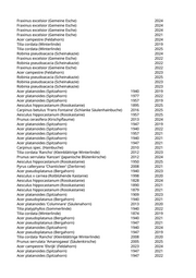 Acer campestre (Feldahorn) 2023 Acer campestre (Feldahorn) 2019 Fraxinus excelsior (Gemeine Esche) 2024 Carpinus betulus 'Fastigiata' (Säulenhainbuche) 2017 2023 Carpinus betulus 'Frans Fontaine' (Schlanke Säulenhainbuche) 2017 2025 Acer campestre 'Korinthosz' (Feldahorn) 2017 2019 Fraxinus excelsior 'Globosa' (Kugelesche) 1947 2023 Fraxinus excelsior 'Globosa' (Kugelesche) 1947 2019 Fraxinus ornus 'Obelisk' (Säulenblumenesche) 2015 2025 Fraxinus excelsior 'Globosa' (Kugelesche) 1940 2025 Fraxinus excelsior 'Globosa' (Kugelesche) 1947 2025 Fraxinus excelsior 'Globosa' (Kugelesche) 1977 2019 Fraxinus excelsior 'Globosa' (Kugelesche) 1947 2025 Fraxinus excelsior 'Globosa' (Kugelesche) 1940 2022 Fraxinus excelsior 'Globosa' (Kugelesche) 1940 2024 Fraxinus excelsior 'Globosa' (Kugelesche) 1940 2019 Tilia x euchlora (Krimlinde) 1940 2022 Tilia cordata (Winterlinde) 1957 2025 Tilia cordata (Winterlinde) 1940 2025 Tilia cordata (Winterlinde) 1940 2019 Tilia cordata (Winterlinde) 1940 2021 Tilia cordata (Winterlinde) 1882 2021 Ulmus minor (Feldulme) 2025 Fraxinus excelsior (Gemeine Esche) 2025 Fraxinus excelsior (Gemeine Esche) 2025 Acer platanoides (Spitzahorn) 2025 Juglans regia (Walnussbaum) 1940 2019 Juglans regia (Walnussbaum) 2019 2024 Juglans regia (Walnussbaum) 1940 2025 Tilia cordata (Winterlinde) 1940 2021 Aesculus x carnea (Rotblühende Kastanie) 1977 2020 Tilia tomentosa 'Brabant' (Silberlinde) 2021 2022 Aesculus hippocastanum (Rosskastanie) 1832 2019 Juglans regia (Walnussbaum) 2019 2020 Juglans regia (Walnussbaum) 2017 2023 Juglans regia (Walnussbaum) 2000 2022 Juglans regia (Walnussbaum) 2023 2024 Juglans regia (Walnussbaum) 2009 2023 Juglans regia (Walnussbaum) 1940 2025 Carpinus betulus 'Frans Fontaine' (Schlanke Säulenhainbuche) 2017 2019 Fraxinus excelsior (Gemeine Esche) 2022 Juglans regia (Walnussbaum) 2022 Populus nigra (Schwarzpappel) 2022 Juglans regia (Walnussbaum) 1947 2024 Juglans regia (Walnussbaum) 1988 2025 Fraxinus excelsior (Gemeine Esche) 2024 Fraxinus excelsior (Gemeine Esche) 2022 Fraxinus excelsior (Gemeine Esche) 2024 Acer pseudoplatanus (Bergahorn) 1950 2019 Tilia tomentosa 'Brabant' (Silberlinde) 2020 2022 Tilia tomentosa 'Brabant' (Silberlinde) 2023 2025