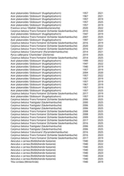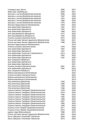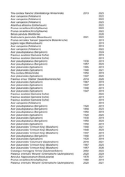 Crataegus spec. (Dorn) 2006 2021 Malus spec. (Apfelbaum) 2004 2021 Aesculus x carnea (Rotblühende Kastanie) 2000 2024 Aesculus x carnea (Rotblühende Kastanie) 1947 2024 Aesculus x carnea (Rotblühende Kastanie) 1957 2023 Aesculus x carnea (Rotblühende Kastanie) 1940 2025 Aesculus x carnea (Rotblühende Kastanie) 1975 2025 Aesculus hippocastanum (Rosskastanie) 1950 2025 Acer platanoides (Spitzahorn) 1967 2019 Acer platanoides (Spitzahorn) 1947 2021 Acer platanoides (Spitzahorn) 1940 2022 Acer pseudoplatanus (Bergahorn) 1977 2022 Acer pseudoplatanus (Bergahorn) 1947 2022 Fraxinus excelsior (Gemeine Esche) 2015 2020 Prunus serrulata 'Kanzan' (Japanische Blütenkirsche) 1950 2021 Prunus serrulata 'Kanzan' (Japanische Blütenkirsche) 1940 2023 Aesculus hippocastanum (Rosskastanie) 2019 Fraxinus excelsior (Gemeine Esche) 1970 2020 Acer platanoides (Spitzahorn) 1947 2020 Acer platanoides (Spitzahorn) 1957 2025 Acer platanoides 'Columnare' (Säulenahorn) 2013 2024 Acer platanoides (Spitzahorn) 1907 2022 Acer platanoides (Spitzahorn) 1957 2020 Acer campestre (Feldahorn) 2021 Acer platanoides (Spitzahorn) 2021 Acer platanoides (Spitzahorn) 2021 Fraxinus excelsior (Gemeine Esche) 2001 2021 Acer platanoides (Spitzahorn) 1997 2025 Acer campestre (Feldahorn) 2019 Robinia pseudoacacia (Scheinakazie) 2022 Fraxinus excelsior (Gemeine Esche) 2025 Robinia pseudoacacia (Scheinakazie) 2019 Robinia pseudoacacia (Scheinakazie) 2019 Tilia tomentosa (Silberlinde) 1950 2025 Tilia tomentosa (Silberlinde) 1960 2025 Tilia tomentosa (Silberlinde) 1940 2023 Tilia tomentosa (Silberlinde) 1940 2020 Carpinus betulus 'Fastigiata' (Säulenhainbuche) 1978 2025 Carpinus betulus 'Fastigiata' (Säulenhainbuche) 2010 2025 Carpinus betulus 'Fastigiata' (Säulenhainbuche) 1985 2025 Carpinus betulus 'Fastigiata' (Säulenhainbuche) 1995 2025 Carpinus betulus 'Fastigiata' (Säulenhainbuche) 1989 2025 Carpinus betulus 'Fastigiata' (Säulenhainbuche) 2007 2025 Carpinus betulus 'Fastigiata' (Säulenhainbuche) 1985 2025 Carpinus betulus 'Fastigiata' (Säulenhainbuche) 1993 2025 Fraxinus ornus 'Obelisk' (Säulenblumenesche) 2011 2020 Fraxinus ornus 'Obelisk' (Säulenblumenesche) 2010 2020 Juglans regia (Walnussbaum) 1980 2019 Prunus serrulata 'Kanzan' (Japanische Blütenkirsche) 2007 2020 Pyrus calleryana 'Chanticleer' (Zierbirne) 2004 2023 Pyrus calleryana 'Chanticleer' (Zierbirne) 2015 2025
