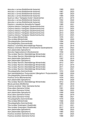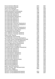 Acer pseudoplatanus (Bergahorn) 2023 Acer pseudoplatanus 'Atropurpureum' (Purpurner Bergahorn) 2020 Betula pendula (Weißbirke) 2023 Betula pendula (Weißbirke) 2019 Betula pendula (Weißbirke) 2022 2024 Aesculus hippocastanum (Rosskastanie) 2025 Prunus padus 'Colorata' (Rotblättrige Traubenkirsche) 2024 Acer platanoides 'Eurostar' (Spitzahorn) 2016 2021 Acer opalus (Italienischer Ahorn) 2022 2024 Prunus avium (Vogelkirsche) 2020 Betula pendula (Weißbirke) 2023 Prunus cerasifera (Kirschpflaume) 1985 2022 Corylus colurna (Baumhasel) 2015 2025 Robinia pseudoacacia (Scheinakazie) 1999 2020 Prunus cerasifera (Kirschpflaume) 2021 Prunus cerasifera (Kirschpflaume) 2022 Acer saccharinum (Silberahorn) 2020 Acer saccharinum (Silberahorn) 2019 Acer saccharinum (Silberahorn) 1999 2025 Sorbus aucuparia (Eberesche) 2020 Sorbus aucuparia (Eberesche) 2023 Sorbus aria (Gewöhnliche Mehlbeere) 2023 Sorbus aucuparia (Eberesche) 2023 Sorbus aucuparia (Eberesche) 2021 Sorbus aucuparia (Eberesche) 2023 Sorbus aucuparia (Eberesche) 2021 Betula pendula (Weißbirke) 2019 Betula pendula (Weißbirke) 2021 2023 Prunus avium (Vogelkirsche) 2019 Acer negundo (Eschenahorn) 1995 2024 Prunus subhirtella 'Accolade' (Jap. Blütenkirsche rosa) 2025 2025 Acer negundo (Eschenahorn) 1997 2022 Robinia pseudoacacia (Scheinakazie) 1985 2020 Platanus x acerifolia (Ahornblättrige Platane) 1989 2019 Platanus x acerifolia (Ahornblättrige Platane) 2021 2022 Acer pseudoplatanus (Bergahorn) 1980 2020 Carpinus betulus 'Columnaris' (Pyramidenhainbuche) 2016 2020 Robinia pseudoacacia (Scheinakazie) 1980 2022 Robinia pseudoacacia (Scheinakazie) 2005 2022 Juglans regia (Walnussbaum) 1989 2025 Robinia pseudoacacia (Scheinakazie) 2020 Robinia pseudoacacia (Scheinakazie) 1985 2022 Elaeagnus angustifolia (Ölweide) 2010 2023 Pinus nigra (Schwarzkiefer, Schwarzföhre) 1990 2020 Betula pendula (Weißbirke) 1995 2024 Betula pendula (Weißbirke) 2020 Betula pendula (Weißbirke) 2019 Betula pendula (Weißbirke) 2010 2021 Betula pendula (Weißbirke) 2000 2022 Malus spec. (Apfelbaum) 2005 2025 Platanus x acerifolia 'Alphens Globe' (Kugelplatane) 2016 2019