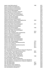 Populus alba (Silberpappel) 2019 Populus simonii (Birkenpappel) 2020 Quercus robur (Stieleiche) 2020 2021 Koelreuteria paniculata 'Fastigiata' (Säulenblasenbaum) 2021 2022 Sequoiadendron giganteum (Mammutbaum) 1988 2024 Quercus robur (Stieleiche) 2020 2021 Populus alba (Silberpappel) 2020 Quercus robur (Stieleiche) 2020 2023 Populus alba (Silberpappel) 2019 Quercus robur (Stieleiche) 2020 2024 Quercus robur (Stieleiche) 2021 2022 Quercus macrantheram (Persische Eiche) 1963 2024 Populus alba (Silberpappel) 2019 Quercus robur (Stieleiche) 2020 2021 Quercus robur 'Fastigiata Koster' (Säuleneiche) 2019 2025 Quercus robur (Stieleiche) 2020 2021 Populus alba (Silberpappel) 1944 2025 Populus nigra (Schwarzpappel) 1989 2025 Populus alba (Silberpappel) 1944 2023 Tetradium daniellii (Samthaarige Stinkesche) 2019 Robinia pseudoacacia (Scheinakazie) 2020 Malus 'Van Eseltine' (Zierapfel) 1994 2024 Prunus cerasifera (Kirschpflaume) 2019 Robinia pseudoacacia (Scheinakazie) 2020 Acer pseudoplatanus 'Leopoldii' (Bergahorn) 1993 2023 Acer negundo (Eschenahorn) 2019 Acer negundo (Eschenahorn) 1988 2023 Acer negundo (Eschenahorn) 2022 Robinia x margaretta 'Casque Rouge' (Scheinakazie Casque Rouge) 2005 2020 Malus hybrida 'Royalty' (Blutapfel) 2019 Malus hybrida 'Royalty' (Blutapfel) 2019 Quercus robur (Stieleiche) 2021 2021 Prunus padus (Traubenkirsche) 2019 Betula pendula (Weißbirke) 2000 2020 Sorbus aucuparia (Eberesche) 2011 2023 Betula pendula 'Youngii' (Echte Hängebirke) 2000 2025 Betula pendula 'Youngii' (Echte Hängebirke) 2001 2025 Prunus cerasifera 'Nigra' (Blutpflaume) 1991 2025 Prunus cerasifera (Kirschpflaume) 1976 2024 Robinia pseudoacacia (Scheinakazie) 1990 2024 Malus 'Van Eseltine' (Zierapfel) 2019 Quercus robur (Stieleiche) 2021 2021 Malus 'Van Eseltine' (Zierapfel) 2004 2024 Acer platanoides (Spitzahorn) 2019 Quercus robur (Stieleiche) 2020 2022 Pinus nigra (Schwarzkiefer, Schwarzföhre) 1975 2024 Pinus nigra (Schwarzkiefer, Schwarzföhre) 1978 2024 Quercus x kewensis (Eiche) 2012 2025 Picea pungens 'Glauca' (Blaufichte) 1985 2024 Paulownia tomentosa (Blauglockenbaum) 2020 Quercus robur (Stieleiche) 2020 2021