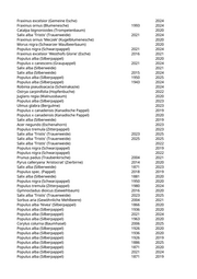 Fraxinus excelsior (Gemeine Esche) 2024 Fraxinus ornus (Blumenesche) 1993 2024 Catalpa bignonioides (Trompetenbaum) 2020 Salix alba 'Tristis' (Trauerweide) 2021 2024 Fraxinus ornus 'Meczek' (Kugelblumenesche) 2020 Morus nigra (Schwarzer Maulbeerbaum) 2020 Populus nigra (Schwarzpappel) 2021 2024 Fraxinus excelsior 'Westhofs Glorie' (Esche) 2016 2021 Populus alba (Silberpappel) 2020 Populus x canescens (Graupappel) 2021 2024 Salix alba (Silberweide) 2021 Salix alba (Silberweide) 2015 2024 Populus alba (Silberpappel) 1950 2025 Populus alba (Silberpappel) 1943 2024 Robinia pseudoacacia (Scheinakazie) 2024 Ostrya carpinifolia (Hopfenbuche) 2022 Juglans regia (Walnussbaum) 2020 Populus alba (Silberpappel) 2023 Ulmus glabra (Bergulme) 2023 Populus x canadensis (Kanadische Pappel) 2019 Populus x canadensis (Kanadische Pappel) 2020 Salix alba (Silberweide) 2019 Acer negundo (Eschenahorn) 2023 Populus tremula (Zitterpappel) 2023 Salix alba 'Tristis' (Trauerweide) 2023 2025 Salix alba 'Tristis' (Trauerweide) 2025 2025 Salix alba 'Tristis' (Trauerweide) 2022 Populus nigra (Schwarzpappel) 2019 Populus nigra (Schwarzpappel) 2022 Prunus padus (Traubenkirsche) 2004 2021 Pyrus calleryana 'Aristocrat' (Zierbirne) 2014 2020 Salix alba (Silberweide) 1871 2023 Populus spec. (Pappel) 2018 2019 Salix alba (Silberweide) 1881 2020 Populus nigra (Schwarzpappel) 1950 2020 Populus tremula (Zitterpappel) 1980 2024 Gymnocladus dioicus (Geweihbaum) 2016 2020 Salix alba 'Tristis' (Trauerweide) 2023 2025 Sorbus aria (Gewöhnliche Mehlbeere) 2004 2021 Populus alba 'Nivea' (Silberpappel) 1866 2020 Populus alba (Silberpappel) 1936 2020 Populus alba (Silberpappel) 2021 2024 Populus alba (Silberpappel) 1963 2020 Corylus colurna (Baumhasel) 2006 2025 Populus alba (Silberpappel) 1926 2020 Populus alba (Silberpappel) 1936 2020 Populus alba (Silberpappel) 1926 2019 Populus alba (Silberpappel) 1886 2025 Populus alba (Silberpappel) 1871 2020 Populus alba (Silberpappel) 2021 2024 Populus alba (Silberpappel) 1871 2019