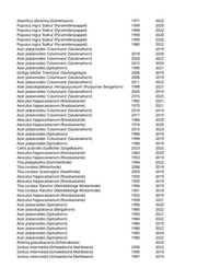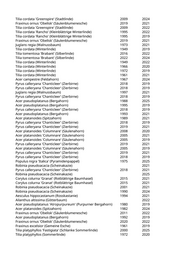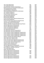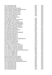 Tilia cordata (Winterlinde) 1991 2022 Tilia cordata (Winterlinde) 1999 2021 Acer platanoides 'Columnare' (Säulenahorn) 2008 2024 Robinia pseudoacacia 'Monophylla' (Straßenakazie) 1999 2024 Tilia platyphyllos (Sommerlinde) 1970 2020 Acer pseudoplatanus (Bergahorn) 1982 2020 Robinia pseudoacacia 'Monophylla' (Straßenakazie) 2005 2024 Acer campestre (Feldahorn) 1980 2024 Acer campestre (Feldahorn) 1989 2025 Fraxinus excelsior (Gemeine Esche) 1977 2025 Acer platanoides (Spitzahorn) 1989 2020 Betula pendula (Weißbirke) 1984 2019 Betula pendula (Weißbirke) 1987 2019 Prunus serrulata 'Kanzan' (Japanische Blütenkirsche) 1999 2021 Betula pendula (Weißbirke) 1982 2020 Prunus serrulata 'Kanzan' (Japanische Blütenkirsche) 2006 2019 Aesculus x carnea (Rotblühende Kastanie) 1995 2019 Aesculus hippocastanum (Rosskastanie) 1945 2019 Platanus x acerifolia 'Tremonia' (Schmalkronige Platane) 2020 2021 Aesculus hippocastanum (Rosskastanie) 1973 2021 Aesculus hippocastanum (Rosskastanie) 1977 2025 Sorbus aria (Gewöhnliche Mehlbeere) 1991 2019 Sorbus aria (Gewöhnliche Mehlbeere) 1991 2022 Acer platanoides (Spitzahorn) 1998 2021 Acer platanoides 'Columnare' (Säulenahorn) 2014 2022 Acer platanoides 'Columnare' (Säulenahorn) 2014 2022 Prunus virginiana 'Shubert' (Rotblättrige Traubenkirsche) 2003 2025 Prunus virginiana 'Shubert' (Rotblättrige Traubenkirsche) 2003 2020 Prunus virginiana 'Shubert' (Rotblättrige Traubenkirsche) 2003 2021 Prunus virginiana 'Shubert' (Rotblättrige Traubenkirsche) 2003 2022 Platanus x acerifolia (Ahornblättrige Platane) 2022 2025 Ulmus 'New Horizon' (Resista Ulme) 2022 2024 Ulmus 'New Horizon' (Resista Ulme) 2022 2024 Prunus serrulata 'Kanzan' (Japanische Blütenkirsche) 1987 2020 Prunus serrulata 'Kanzan' (Japanische Blütenkirsche) 1982 2021 Acer platanoides 'Columnare' (Säulenahorn) 2004 2019 Fraxinus excelsior (Gemeine Esche) 1977 2020 Ailanthus altissima (Götterbaum) 1996 2019 Aesculus hippocastanum (Rosskastanie) 1989 2020 Tilia platyphyllos 'Fastigiata' (Schlanke Sommerlinde) 1999 2024 Pyrus calleryana 'Chanticleer' (Zierbirne) 2014 2024 Tilia cordata (Winterlinde) 1982 2024 Juglans regia (Walnussbaum) 2024 Aesculus hippocastanum (Rosskastanie) 1979 2024 Aesculus hippocastanum (Rosskastanie) 1985 2025 Aesculus hippocastanum (Rosskastanie) 1974 2025 Aesculus hippocastanum (Rosskastanie) 1983 2023 Ailanthus altissima (Götterbaum) 2024 Aesculus hippocastanum (Rosskastanie) 1996 2020 Aesculus hippocastanum (Rosskastanie) 1974 2025 Aesculus hippocastanum (Rosskastanie) 1972 2020
