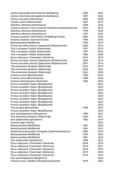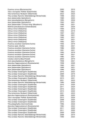 Fraxinus ornus (Blumenesche) 2000 2019 Tilia x europaea 'Pallida' (Kaiserlinde) 1980 2022 Tilia tomentosa 'Brabant' (Silberlinde) 2022 2023 Tilia cordata 'Rancho' (Kleinblättrige Winterlinde) 1998 2022 Acer platanoides (Spitzahorn) 1989 2025 Acer pseudoplatanus (Bergahorn) 1995 2024 Acer platanoides (Spitzahorn) 1992 2021 Acer platanoides 'Crimson King' (Blutahorn) 1996 2021 Robinia pseudoacacia (Scheinakazie) 1997 2024 Ulmus minor (Feldulme) 1994 2019 Ulmus minor (Feldulme) 1994 2019 Ulmus minor (Feldulme) 1997 2021 Ulmus minor (Feldulme) 1984 2021 Ulmus minor (Feldulme) 1995 2021 Ulmus minor (Feldulme) 1997 2021 Ulmus minor (Feldulme) 1992 2021 Fraxinus excelsior (Gemeine Esche) 1956 2019 Fraxinus spec. (Esche) 1966 2021 Fraxinus excelsior (Gemeine Esche) 1986 2025 Fraxinus excelsior (Gemeine Esche) 1991 2021 Fraxinus excelsior (Gemeine Esche) 1995 2019 Fraxinus excelsior (Gemeine Esche) 1987 2021 Fraxinus excelsior (Gemeine Esche) 1985 2021 Corylus colurna (Baumhasel) 2003 2019 Acer pseudoplatanus (Bergahorn) 1958 2021 Aesculus hippocastanum (Rosskastanie) 1958 2020 Acer platanoides (Spitzahorn) 1965 2021 Acer platanoides (Spitzahorn) 1999 2021 Acer platanoides (Spitzahorn) 1996 2022 Tilia cordata 'Greenspire' (Stadtlinde) 2016 2025 Tilia cordata 'Greenspire' (Stadtlinde) 2009 2019 Tilia cordata 'Rancho' (Kleinblättrige Winterlinde) 1999 2019 Tilia cordata 'Greenspire' (Stadtlinde) 2015 2021 Tilia tomentosa 'Brabant' (Silberlinde) 2021 2023 Tilia cordata 'Rancho' (Kleinblättrige Winterlinde) 1995 2020 Tilia cordata 'Greenspire' (Stadtlinde) 2016 2020 Tilia cordata 'Greenspire' (Stadtlinde) 2011 2024 Tilia cordata 'Greenspire' (Stadtlinde) 2015 2023 Tilia cordata 'Greenspire' (Stadtlinde) 2015 2020 Tilia tomentosa 'Brabant' (Silberlinde) 2021 2023 Aesculus hippocastanum (Rosskastanie) 2006 2020 Tilia x europaea 'Pallida' (Kaiserlinde) 2015 2024 Tilia cordata 'Greenspire' (Stadtlinde) 2008 2020 Tilia cordata 'Greenspire' (Stadtlinde) 2015 2024 Tilia platyphyllos (Sommerlinde) 1996 2024 Aesculus hippocastanum (Rosskastanie) 1982 2022 Tilia cordata 'Greenspire' (Stadtlinde) 2011 2020 Tilia cordata 'Greenspire' (Stadtlinde) 2011 2020 Tilia cordata 'Greenspire' (Stadtlinde) 2009 2020 Tilia cordata 'Rancho' (Kleinblättrige Winterlinde) 2008 2019 Tilia cordata 'Rancho' (Kleinblättrige Winterlinde) 1990 2025