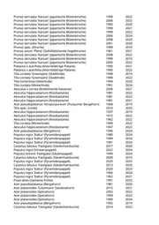 Acer platanoides 'Olmstedt' (Säulenspitzahorn) 2002 2021 Acer platanoides 'Columnare' (Säulenahorn) 2009 2025 Acer pseudoplatanus (Bergahorn) 1998 2021 Gleditsia triacanthos 'Inermis' (Dornenloser Lederhülsenbaum) 1993 2022 Acer pseudoplatanus 'Erectum' (Schmalkroniger Bergahorn) 1992 2019 Acer platanoides (Spitzahorn) 2000 2022 Ulmus minor (Feldulme) 2019 Ulmus minor (Feldulme) 2021 Robinia pseudoacacia (Scheinakazie) 1996 2024 Betula pendula (Weißbirke) 1988 2019 Betula pendula (Weißbirke) 1990 2023 Fraxinus excelsior 'Atlas' (Gemeine Esche) 2012 2024 Fraxinus excelsior 'Atlas' (Gemeine Esche) 2012 2024 Fraxinus pennsylvanica 'Cimmaron' (Rotesche) 2019 2022 Fraxinus excelsior 'Atlas' (Gemeine Esche) 2015 2020 Tilia x europaea 'Pallida' (Kaiserlinde) 2003 2025 Prunus avium (Vogelkirsche) 1995 2022 Fraxinus excelsior (Gemeine Esche) 1999 2022 Fraxinus excelsior (Gemeine Esche) 1999 2022 Fraxinus excelsior (Gemeine Esche) 1999 2023 Fraxinus excelsior 'Atlas' (Gemeine Esche) 2016 2024 Prunus serrulata 'Kanzan' (Japanische Blütenkirsche) 1987 2020 Prunus serrulata 'Kanzan' (Japanische Blütenkirsche) 1995 2021 Prunus serrulata 'Kanzan' (Japanische Blütenkirsche) 2005 2020 Prunus serrulata 'Kanzan' (Japanische Blütenkirsche) 2000 2020 Prunus serrulata 'Kanzan' (Japanische Blütenkirsche) 1998 2022 Prunus serrulata 'Kanzan' (Japanische Blütenkirsche) 2009 2022 Prunus serrulata 'Kanzan' (Japanische Blütenkirsche) 1995 2020 Prunus serrulata 'Kanzan' (Japanische Blütenkirsche) 1990 2019 Prunus serrulata 'Kanzan' (Japanische Blütenkirsche) 1988 2021 Prunus serrulata 'Kanzan' (Japanische Blütenkirsche) 2000 2023 Prunus avium (Vogelkirsche) 1988 2022 Prunus serrulata 'Kanzan' (Japanische Blütenkirsche) 1998 2022 Prunus serrulata 'Kanzan' (Japanische Blütenkirsche) 1998 2022 Prunus serrulata 'Kanzan' (Japanische Blütenkirsche) 1999 2022 Prunus serrulata 'Kanzan' (Japanische Blütenkirsche) 2008 2025 Prunus serrulata 'Kanzan' (Japanische Blütenkirsche) 1998 2022 Prunus serrulata 'Kanzan' (Japanische Blütenkirsche) 1999 2020 Prunus serrulata 'Kanzan' (Japanische Blütenkirsche) 2006 2020 Prunus serrulata 'Kanzan' (Japanische Blütenkirsche) 1995 2019 Prunus serrulata 'Kanzan' (Japanische Blütenkirsche) 2000 2020 Prunus serrulata 'Kanzan' (Japanische Blütenkirsche) 2004 2022 Prunus serrulata 'Kanzan' (Japanische Blütenkirsche) 2005 2024 Prunus serrulata 'Kanzan' (Japanische Blütenkirsche) 2000 2019 Prunus serrulata 'Kanzan' (Japanische Blütenkirsche) 1994 2020 Prunus serrulata 'Kanzan' (Japanische Blütenkirsche) 1997 2019 Prunus serrulata 'Kanzan' (Japanische Blütenkirsche) 1999 2019 Prunus avium (Vogelkirsche) 1997 2019 Prunus serrulata 'Kanzan' (Japanische Blütenkirsche) 2007 2020 Prunus serrulata 'Kanzan' (Japanische Blütenkirsche) 2001 2020 Prunus serrulata 'Kanzan' (Japanische Blütenkirsche) 2007 2020
