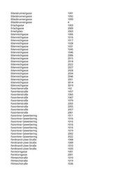 Leebgasse 1013 Leebgasse 2003 Leopold-Prucha-Gasse 4006 Leopold-Prucha-Gasse 4010 Leopold-Prucha-Gasse 4019 Leopoldsdorfer Straße 2017 Leopoldsdorfer Straße 2026 Leopoldsdorfer Straße 2044 Leopoldsdorfer Straße 2045 Leopoldsdorfer Straße 2053 Leopoldsdorfer Straße 2058 Leopoldsdorfer Straße 2062 Leopoldsdorfer Straße 2069 Liesingbachstraße 1005/A Liesingbachstraße 1006 Liesingbachstraße 2001 Liesingbachstraße 2035 Ludwig-von-Höhnel-Gasse 1002 Ludwig-von-Höhnel-Gasse 1022 Ludwig-von-Höhnel-Gasse 110 Ludwig-von-Höhnel-Gasse 207 Ludwig-von-Höhnel-Gasse 215 Maria-Lassnig-Straße 2030 Marianne-Pollak-Gasse 1003 Marianne-Pollak-Gasse 1003 Marianne-Pollak-Gasse 1005 Migerkastraße 1022 Migerkastraße 1023 Migerkastraße 2004 Migerkastraße 2005 Migerkastraße 2006 Munchplatz 1001 Munchplatz 2009 Mundygasse 1001 Mundygasse 2001 Neilreichgasse 1003 Neilreichgasse 1006 Neilreichgasse 1007 Neilreichgasse 1007 Neilreichgasse 1011 Neilreichgasse 1014 Neilreichgasse 1021 Neilreichgasse 1029 Neilreichgasse 1030 Neilreichgasse 1033 Neilreichgasse 1036 Neilreichgasse 1041 Neilreichgasse 1042 Neilreichgasse 1088 Neilreichgasse 2012 Neilreichgasse 2019