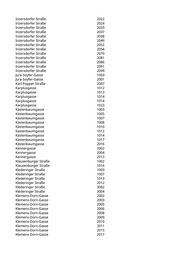 Inzersdorfer Straße 2022 Inzersdorfer Straße 2024 Inzersdorfer Straße 2033 Inzersdorfer Straße 2037 Inzersdorfer Straße 2038 Inzersdorfer Straße 2049 Inzersdorfer Straße 2052 Inzersdorfer Straße 2054 Inzersdorfer Straße 2079 Inzersdorfer Straße 2081 Inzersdorfer Straße 2086 Inzersdorfer Straße 2091 Inzersdorfer Straße 2099 Jura-Soyfer-Gasse 1003 Jura-Soyfer-Gasse 2001 Karl-Popper-Straße 2007 Karplusgasse 1012 Karplusgasse 1013 Karplusgasse 1014 Karplusgasse 1014 Karplusgasse 1023 Kästenbaumgasse 1003 Kästenbaumgasse 1005 Kästenbaumgasse 1007 Kästenbaumgasse 1008 Kästenbaumgasse 1010 Kästenbaumgasse 1012 Kästenbaumgasse 1014 Kästenbaumgasse 1017 Kästenbaumgasse 2016 Kennergasse 2002 Kennergasse 2004 Kennergasse 2013 Klausenburger Straße 1002 Klausenburger Straße 1016 Klederinger Straße 1003 Klederinger Straße 1007 Klederinger Straße 1013 Klederinger Straße 2012 Klederinger Straße 3002 Klederinger Straße 3004 Klemens-Dorn-Gasse 2002 Klemens-Dorn-Gasse 2003 Klemens-Dorn-Gasse 2005 Klemens-Dorn-Gasse 2006 Klemens-Dorn-Gasse 2008 Klemens-Dorn-Gasse 2009 Klemens-Dorn-Gasse 2010 Klemens-Dorn-Gasse 2011 Klemens-Dorn-Gasse 2015 Klemens-Dorn-Gasse 2017