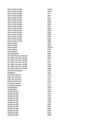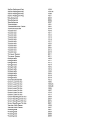 Otto-Probst-Straße 164/A Otto-Probst-Straße 166/A Otto-Probst-Straße 170 Otto-Probst-Straße 2012 Otto-Probst-Straße 204 Otto-Probst-Straße 2042 Otto-Probst-Straße 2059 Otto-Probst-Straße 2064 Otto-Probst-Straße 2071 Otto-Probst-Straße 2080 Otto-Probst-Straße 2090 Otto-Probst-Straße 2093 Otto-Probst-Straße 2095 Otto-Probst-Straße 2096 Otto-Probst-Straße 3022 Otto-Probst-Straße 3049 Paltramplatz 1002 Paltramplatz 2002 Paltramplatz 2002/A Passinigasse 1003 Passinigasse 2002 Patrubangasse 1002 Per-Albin-Hansson-Straße 2001 Per-Albin-Hansson-Straße 2003 Per-Albin-Hansson-Straße 2011 Per-Albin-Hansson-Straße 2017 Per-Albin-Hansson-Straße 2018 Per-Albin-Hansson-Straße 2033 Per-Albin-Hansson-Straße 2045 Pernerstorfergasse 1002 Pickgasse 1001 Platz der Kulturen 1015 Platz der Kulturen 1015 Platz der Kulturen 1017 Platz der Kulturen 1019 Puchsbaumgasse 1017 Puchsbaumgasse 1027 Quellenplatz 1006 Quellenplatz 1010 Quellenstraße 1004 Quellenstraße 1031 Quellenstraße 1037 Quellenstraße 1038 Quellenstraße 1045 Quellenstraße 2001 Quellenstraße 2001 Quellenstraße 2002 Quellenstraße 2002 Quellenstraße 2003 Quellenstraße 2004 Quellenstraße 2004