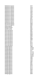 Weißenthurngasse 1017 Weißenthurngasse 1018 Weißenthurngasse 1019 Weißenthurngasse 1023 Weißenthurngasse 1024 Weißenthurngasse 1025 Weißenthurngasse 1026 Weißenthurngasse 1027 Weißenthurngasse 1028 Weißenthurngasse 2001 Weißenthurngasse 2010 Weißenthurngasse 2013 Weißenthurngasse 2014 Werthenburggasse 2004 Werthenburggasse 2009 Wildauergasse 2001 Wildgartenallee 2061 Wilhelmstraße 2006 Wittmayergasse 2001 Wittmayergasse 2002 Wittmayergasse 2003 Wittmayergasse 2004 Wittmayergasse 2006 Wittmayergasse 2007 Wittmayergasse 2008 Wittmayergasse 2009 Wittmayergasse 2011 Wittmayergasse 2012 Wittmayergasse 2013 Wittmayergasse 2014 Wolfganggasse 1008 Wolfganggasse 1010/B Wolfganggasse 1010/C Wolfganggasse 1011 Wolfganggasse 1011/A Wolfganggasse 1011/B Wolfganggasse 1018/A Wolfganggasse 1030/A Wolfganggasse 1050 Wolfganggasse 1058 Wolfganggasse 1059 Wolfganggasse 1062 Wolfganggasse 2001 Wolfganggasse 2005 Wolfganggasse 2010 Wolfganggasse 2013 Wolfganggasse 2019 Wolfganggasse 2028 Wolfganggasse 2032 Wolfganggasse 2035 Wolfganggasse 2039