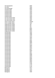 Am Fasangarten 2030 Am Platz 1004 Am Rosenhügel 2009 Amalienstraße 1004 Amalienstraße 1024 Amalienstraße 1033 Amalienstraße 1034 Amalienstraße 1042 Amalienstraße 1043 Am-Hans-Moser-Park 1002 Am-Hans-Moser-Park 1005 Am-Hans-Moser-Park 1007 Anton-Langer-Gasse 1020/A Anton-Langer-Gasse 1022 Atzgersdorfer Straße 148 Atzgersdorfer Straße 150 Atzgersdorfer Straße 158 Atzgersdorfer Straße 2002 Atzgersdorfer Straße 2002 Atzgersdorfer Straße 2016 Auhofstraße 1003 Auhofstraße 1006 Auhofstraße 1008 Auhofstraße 1016 Auhofstraße 1055 Auhofstraße 1057 Auhofstraße 2005 Auhofstraße 2006 Auhofstraße 2009 Auhofstraße 2014 Auhofstraße 2020 Auhofstraße 2022 Auhofstraße 2023 Auhofstraße 2027 Auhofstraße 2029 Auhofstraße 2031 Auhofstraße 2032 Auhofstraße 2038 Auhofstraße 2039 Auhofstraße 2043 Auhofstraße 2044 Auhofstraße 2063 Auhofstraße 2099 Auhofstraße 2105 Auhofstraße 2108 Auhofstraße 2118 Auhofstraße 2126 Beckgasse 1012 Beckgasse 1016 Beckgasse 1022 Beckgasse 1043