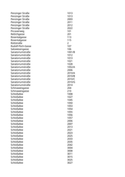 Penzinger Straße 1013 Penzinger Straße 1013 Penzinger Straße 2003 Penzinger Straße 2011 Penzinger Straße 2012 Penzinger Straße 2022 Piccaverweg 101 Rettichgasse 201 Rosentalgasse 113 Rosentalgasse 115 Rottstraße 2 Rudolf-Pöch-Gasse 107 Salzwiesengasse 106 Sanatoriumstraße 1001/B Sanatoriumstraße 1012 Sanatoriumstraße 1013 Sanatoriumstraße 1021 Sanatoriumstraße 1028 Sanatoriumstraße 1052/A Sanatoriumstraße 2006 Sanatoriumstraße 2010/A Sanatoriumstraße 2010/B Sanatoriumstraße 2010/C Sanatoriumstraße 2010/G Sanatoriumstraße 2014 Schinaweisgasse 204 Schinaweisgasse 210 Schloßallee 1008 Schloßallee 1027 Schloßallee 1045 Schloßallee 1050 Schloßallee 1053 Schloßallee 1054 Schloßallee 1055 Schloßallee 1056 Schloßallee 1057 Schloßallee 2006 Schloßallee 2007 Schloßallee 2013 Schloßallee 2021 Schloßallee 2023 Schloßallee 2025 Schloßallee 2033 Schloßallee 2035 Schloßallee 2042 Schloßallee 3004 Schloßallee 3008 Schloßallee 3011 Schloßallee 3015 Schloßallee 3025 Schloßallee 3027