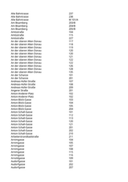 Alte Bahntrasse 237 Alte Bahntrasse 238 Alte Bahntrasse M 101/A Am Bisamberg 203/B Am Bisamberg 204/B Am Bisamberg 205/B Amtsstraße 104 Amtsstraße 115 Amtsstraße 227 An der oberen Alten Donau 117 An der oberen Alten Donau 118 An der oberen Alten Donau 119 An der oberen Alten Donau 120 An der oberen Alten Donau 120 An der oberen Alten Donau 121 An der oberen Alten Donau 122 An der oberen Alten Donau 122 An der oberen Alten Donau 126 An der oberen Alten Donau 128 An der oberen Alten Donau 135 An der Schanze 101 An der Schanze 201 Andreas-Hofer-Straße 107 Andreas-Hofer-Straße 108 Andreas-Hofer-Straße 209 Angerer Straße 201 Anton-Anderer-Platz 102 Anton-Anderer-Platz 102 Anton-Böck-Gasse 103 Anton-Böck-Gasse 104 Anton-Böck-Gasse 105 Anton-Böck-Gasse 204 Anton-Schall-Gasse 101 Anton-Schall-Gasse 112 Anton-Schall-Gasse 113 Anton-Schall-Gasse 120 Anton-Schall-Gasse 121 Anton-Schall-Gasse 201 Anton-Schall-Gasse 202 Anton-Schall-Gasse 210 Arbeiterstrandbadstraße 211 Arnimgasse 104 Arnimgasse 105 Arnimgasse 107 Arnimgasse 108 Arnimgasse 115 Arnimgasse 116 Arnoldgasse 109 Audorfgasse 101 Audorfgasse 202 Audorfgasse 207
