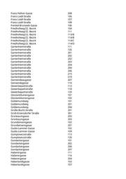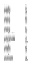 Hartlebengasse 214 Hartlebengasse 217 Hartlebengasse 218 Hartlebengasse 226 Hartlebengasse 227 Hartlebengasse 232 Hartlebengasse 234 Hausfeldstraße 105 Hausfeldstraße 151 Hausfeldstraße 2003 Hausfeldstraße 2023 Hausfeldstraße 2089 Hausfeldstraße 2090 Hausfeldstraße 2102 Hausfeldstraße 2104 Hausfeldstraße 2106 Hausfeldstraße 2107 Hausfeldstraße 2108 Hausfeldstraße 2109 Hausfeldstraße 2114 Hausfeldstraße 2117 Hausfeldstraße 2117 Hausfeldstraße 2127 Hausfeldstraße 2130 Hausfeldstraße 302 Hermann-Gebauer-Straße 102 Hermann-Gebauer-Straße 110 Hermann-Gebauer-Straße 111 Hermann-Gebauer-Straße 115 Hermann-Gebauer-Straße 129 Hermann-Gebauer-Straße 201 Hermann-Gebauer-Straße 202 Hermann-Gebauer-Straße 242 Heustadelgasse 106/B Heustadelgasse 106/C Heustadelgasse 108 Heustadelgasse 113 Heustadelgasse 206 Heustadelgasse 207 Heustadelgasse 216 Heustadelgasse 220 Heustadelgasse 226 Heustadelgasse 227 Heustadelgasse 228 Heustadelgasse 229 Hirschstettner Straße 104 Hirschstettner Straße 105 Hirschstettner Straße 112 Hirschstettner Straße 114 Hirschstettner Straße 117/A Hirschstettner Straße 117/C