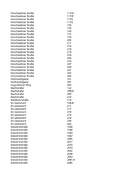 Hirschstettner Straße 117/D Hirschstettner Straße 117/E Hirschstettner Straße 117/J Hirschstettner Straße 117/J Hirschstettner Straße 120 Hirschstettner Straße 122 Hirschstettner Straße 126 Hirschstettner Straße 127 Hirschstettner Straße 133 Hirschstettner Straße 205 Hirschstettner Straße 211 Hirschstettner Straße 216 Hirschstettner Straße 218 Hirschstettner Straße 219 Hirschstettner Straße 224 Hirschstettner Straße 226 Hirschstettner Straße 233 Hirschstettner Straße 247 Hirschstettner Straße 258 Hirschstettner Straße 261 Hirschstettner Straße 262 Hirschstettner Straße 263 Hochmuthgasse 101 Hochmuthgasse 201 Hugo-Wiener-Weg 202 Ibachstraße 122 Ibachstraße 208/A Ibachstraße 209 Ibachstraße 210 Ilse-Buck-Straße 114 Im Gestockert 106/B Im Gestockert 211 Im Gestockert 217 Im Gestockert 218 Im Gestockert 219 Im Gestockert 224 Im Gestockert 229 Im Gestockert 242 Industriestraße 1038 Industriestraße 1048 Industriestraße 1053 Industriestraße 1067 Industriestraße 2005 Industriestraße 2017 Industriestraße 2018 Industriestraße 2019 Industriestraße 2032 Industriestraße 2038 Industriestraße 2063 Industriestraße 2081/A Industriestraße 2085