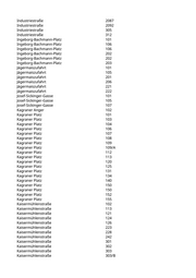 Industriestraße 2087 Industriestraße 2092 Industriestraße 305 Industriestraße 312 Ingeborg-Bachmann-Platz 101 Ingeborg-Bachmann-Platz 106 Ingeborg-Bachmann-Platz 106 Ingeborg-Bachmann-Platz 202 Ingeborg-Bachmann-Platz 202 Ingeborg-Bachmann-Platz 203 Jägermaiszufahrt 101 Jägermaiszufahrt 105 Jägermaiszufahrt 201 Jägermaiszufahrt 206 Jägermaiszufahrt 221 Jägermaiszufahrt 222 Josef-Sickinger-Gasse 101 Josef-Sickinger-Gasse 105 Josef-Sickinger-Gasse 107 Kagraner Anger 102 Kagraner Platz 101 Kagraner Platz 103 Kagraner Platz 104 Kagraner Platz 106 Kagraner Platz 107 Kagraner Platz 108 Kagraner Platz 109 Kagraner Platz 109/A Kagraner Platz 112 Kagraner Platz 113 Kagraner Platz 120 Kagraner Platz 125 Kagraner Platz 131 Kagraner Platz 134 Kagraner Platz 140 Kagraner Platz 150 Kagraner Platz 150 Kagraner Platz 152 Kagraner Platz 155 Kaisermühlenstraße 102 Kaisermühlenstraße 113 Kaisermühlenstraße 121 Kaisermühlenstraße 124 Kaisermühlenstraße 126 Kaisermühlenstraße 223 Kaisermühlenstraße 228 Kaisermühlenstraße 242 Kaisermühlenstraße 301 Kaisermühlenstraße 302 Kaisermühlenstraße 303 Kaisermühlenstraße 303/B