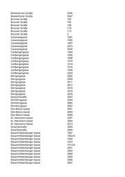 Breitenfurter Straße 5045 Breitenfurter Straße 5047 Brunner Straße 102 Brunner Straße 105 Brunner Straße 106 Brunner Straße 110 Brunner Straße 113 Brunner Straße 2 Canavesegasse 1001 Canavesegasse 1003 Canavesegasse 1007 Canavesegasse 2015 Canavesegasse 2020 Carlbergergasse 1004 Carlbergergasse 1005 Carlbergergasse 1008 Carlbergergasse 1010 Carlbergergasse 1014 Carlbergergasse 1016 Carlbergergasse 1040 Carlbergergasse 2024 Dernjacgasse 2002 Dernjacgasse 2003 Dernjacgasse 2011 Dernjacgasse 2012 Dernjacgasse 2016 Dernjacgasse 2018 Dernjacgasse 2033 Deutschstraße 2007 Dirmhirngasse 2003 Dirmhirngasse 2005 Dirmhirngasse 2007 Don-Bosco-Gasse 2001 Don-Bosco-Gasse 2003 Don-Bosco-Gasse 2004 Dr.-Neumann-Gasse 2001 Dr.-Neumann-Gasse 2004 Dr.-Neumann-Gasse 2013 Draschestraße 2003 Draschestraße 2004 Eduard-Kittenberger-Gasse 1001 Eduard-Kittenberger-Gasse 1002/A Eduard-Kittenberger-Gasse 1004 Eduard-Kittenberger-Gasse 1010 Eduard-Kittenberger-Gasse 1012/A Eduard-Kittenberger-Gasse 2001 Eduard-Kittenberger-Gasse 2003 Eduard-Kittenberger-Gasse 2004 Eduard-Kittenberger-Gasse 2005 Eduard-Kittenberger-Gasse 2006 Eduard-Kittenberger-Gasse 2007