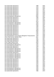 Acer pseudoplatanus (Bergahorn) 1978 2020 Acer pseudoplatanus (Bergahorn) 1935 2021 Acer platanoides (Spitzahorn) 1978 2020 Acer platanoides (Spitzahorn) 1935 2020 Robinia pseudoacacia (Scheinakazie) 1927 2022 Robinia pseudoacacia (Scheinakazie) 1986 2025 Prunus cerasifera 'Nigra' (Blutpflaume) 2000 2020 Robinia pseudoacacia (Scheinakazie) 1999 2020 Robinia pseudoacacia (Scheinakazie) 1927 2021 Fraxinus ornus (Blumenesche) 1972 2020 Fraxinus ornus 'Obelisk' (Säulenblumenesche) 2013 2021 Robinia pseudoacacia 'Bessioniana' (Kegelakazie) 2001 2024 Carpinus betulus 'Frans Fontaine' (Schlanke Säulenhainbuche) 2012 2023 Carpinus betulus 'Frans Fontaine' (Schlanke Säulenhainbuche) 2012 2023 Carpinus betulus 'Frans Fontaine' (Schlanke Säulenhainbuche) 2020 2023 Carpinus betulus 'Frans Fontaine' (Schlanke Säulenhainbuche) 2020 2022 Carpinus betulus 'Frans Fontaine' (Schlanke Säulenhainbuche) 2012 2022 Carpinus betulus 'Frans Fontaine' (Schlanke Säulenhainbuche) 2020 2024 Carpinus betulus 'Fastigiata' (Säulenhainbuche) 2015 2021 Carpinus betulus 'Fastigiata' (Säulenhainbuche) 2015 2021 Carpinus betulus 'Frans Fontaine' (Schlanke Säulenhainbuche) 2012 2019 Carpinus betulus 'Frans Fontaine' (Schlanke Säulenhainbuche) 2012 2019 Carpinus betulus 'Frans Fontaine' (Schlanke Säulenhainbuche) 2012 2019 Prunus cerasifera 'Nigra' (Blutpflaume) 1988 2021 Prunus cerasifera 'Nigra' (Blutpflaume) 1988 2025 Prunus cerasifera 'Nigra' (Blutpflaume) 1988 2023 Acer pseudoplatanus (Bergahorn) 1962 2022 Acer platanoides (Spitzahorn) 1984 2022 Acer x freemanii 'Armstrong' (Freemanii-Ahorn) 2020 2024 Acer platanoides (Spitzahorn) 2004 2020 Acer platanoides (Spitzahorn) 2004 2023 Acer platanoides (Spitzahorn) 2004 2020 Acer platanoides (Spitzahorn) 2004 2020 Acer platanoides (Spitzahorn) 2004 2020 Acer platanoides (Spitzahorn) 2004 2020 Acer platanoides (Spitzahorn) 2004 2020 Acer pseudoplatanus (Bergahorn) 1975 2021 Acer platanoides (Spitzahorn) 1978 2022 Tilia cordata 'Rancho' (Kleinblättrige Winterlinde) 2013 2022 Tilia americana 'Nova' (Amerikanische Linde) 2006 2024 Tilia platyphyllos (Sommerlinde) 1965 2020 Acer platanoides (Spitzahorn) 1942 2020 Acer platanoides (Spitzahorn) 2006 2020 Prunus eminens 'Umbraculifera' (Kugelkirsche) 2019 2023 Acer pseudoplatanus (Bergahorn) 1947 2019 Malus spec. (Apfelbaum) 1990 2020 Tilia cordata 'Greenspire' (Stadtlinde) 2013 2020 Acer pseudoplatanus (Bergahorn) 1957 2019 Tilia cordata 'Rancho' (Kleinblättrige Winterlinde) 1965 2019 Acer tataricum (Feuerahorn) 1987 2022 Tilia cordata 'Rancho' (Kleinblättrige Winterlinde) 2005 2020