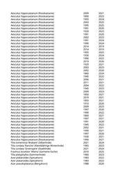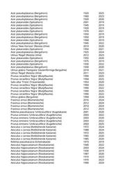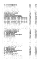 Robinia pseudoacacia (Scheinakazie) 2023 Acer platanoides (Spitzahorn) 2019 Prunus padus (Traubenkirsche) 2002 2025 Carpinus betulus 'Columnaris' (Pyramidenhainbuche) 2020 2023 Carpinus betulus (Hainbuche) 2023 2024 Acer pseudoplatanus (Bergahorn) 1997 2023 Liriodendron tulipifera 'Arnold' (Säulentulpenbaum) 2019 2025 Acer pseudoplatanus (Bergahorn) 1939 2020 Liriodendron tulipifera 'Arnold' (Säulentulpenbaum) 2019 2022 Betula pendula 'Youngii' (Echte Hängebirke) 2019 2022 Betula pendula (Weißbirke) 2018 2023 Catalpa bignonioides (Trompetenbaum) 2019 Acer platanoides 'Columnare' (Säulenahorn) 2018 2024 Betula pendula 'Youngii' (Echte Hängebirke) 2019 2022 Liriodendron tulipifera 'Arnold' (Säulentulpenbaum) 2022 2024 Betula pendula (Weißbirke) 2019 Acer platanoides (Spitzahorn) 2019 Acer platanoides (Spitzahorn) 2019 Acer platanoides (Spitzahorn) 2019 Acer platanoides 'Eurostar' (Spitzahorn) 2022 2023 Malus spec. (Apfelbaum) 2020 Prunus padus (Traubenkirsche) 2019 Aesculus hippocastanum (Rosskastanie) 2022 Acer tataricum (Feuerahorn) 2022 Prunus cerasifera 'Nigra' (Blutpflaume) 2021 Acer platanoides (Spitzahorn) 2019 Platanus x acerifolia (Ahornblättrige Platane) 1899 2020 Platanus x acerifolia 'Tremonia' (Schmalkronige Platane) 2020 2022 Prunus padus (Traubenkirsche) 2021 Prunus padus (Traubenkirsche) 2021 Populus nigra (Schwarzpappel) 2020 Liquidambar styraciflua (Amberbaum) 2010 2023 Prunus cerasifera 'Nigra' (Blutpflaume) 2008 2024 Prunus spec. (Kirsche) 2013 2020 Prunus serrulata 'Amanogawa' (Säulenkirsche) 2021 2023 Prunus avium (Vogelkirsche) 2013 2022 Prunus spec. (Kirsche) 2013 2020 Fraxinus excelsior 'Diversifolia' (Einblättrige Esche) 2013 2024 Tilia cordata (Winterlinde) 2013 2021 Fraxinus excelsior 'Diversifolia' (Einblättrige Esche) 2013 2024 Fraxinus excelsior 'Diversifolia' (Einblättrige Esche) 2013 2024 Tilia cordata (Winterlinde) 2013 2021 Fraxinus excelsior 'Diversifolia' (Einblättrige Esche) 2013 2025 Fraxinus excelsior 'Diversifolia' (Einblättrige Esche) 2013 2025 Fraxinus angustifolia 'Raywood' (Schmalblättrige Esche) 2013 2021 Sorbus aucuparia (Eberesche) 2013 2023 Pyrus calleryana 'Aristocrat' (Zierbirne) 2013 2022 Acer negundo (Eschenahorn) 2019 Taxus baccata (Heimische Eibe) 2011 2023 Acer platanoides (Spitzahorn) 2019 Acer pseudoplatanus (Bergahorn) 2021