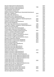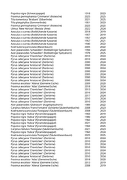 Aesculus hippocastanum (Rosskastanie) 2019 Gleditsia triacanthos (Lederhülsenbaum) 1966 2022 Gleditsia triacanthos (Lederhülsenbaum) 2019 Tilia platyphyllos (Sommerlinde) 2020 Carpinus betulus (Hainbuche) 2020 Gleditsia triacanthos 'Elegantissima' (Säulenlederhülsenbaum) 2019 Malus spec. (Apfelbaum) 2018 2020 Acer platanoides (Spitzahorn) 2019 Gymnocladus dioicus (Geweihbaum) 1977 2024 Paulownia tomentosa (Blauglockenbaum) 2019 Liriodendron tulipifera 'Fastigiatum' (Säulentulpenbaum) 2020 2022 Picea abies (Gemeine Fichte) 2013 2024 Gleditsia triacanthos (Lederhülsenbaum) 1935 2022 Betula pendula (Weißbirke) 2020 Pinus nigra nigra (Österreichische Schwarzkiefer) 1999 2024 Liriodendron tulipifera 'Fastigiatum' (Säulentulpenbaum) 2018 2020 Malus tschonoskii (Zierapfel) 2020 2021 Populus nigra 'Italica' (Pyramidenpappel) 1935 2024 Chamaecyparis lawsoniana (Scheinzypresse) 2019 Carpinus betulus 'Fastigiata' (Säulenhainbuche) 2022 2024 Populus x canadensis (Kanadische Pappel) 2019 Betula pendula 'Fastigiata' (Säulenbirke) 2020 2022 Acer truncatum 'Pacific Sunset' (Pazifischer Ahorn) 2023 2024 Betula pendula 'Fastigiata' (Säulenbirke) 2020 2023 Acer truncatum 'Pacific Sunset' (Pazifischer Ahorn) 2023 2024 Elaeagnus angustifolia (Ölweide) 1994 2023 Betula pendula 'Youngii' (Echte Hängebirke) 2019 2021 Betula pendula 'Youngii' (Echte Hängebirke) 2019 2022 Betula pendula (Weißbirke) 2019 2021 Prunus cerasifera 'Nigra' (Blutpflaume) 2019 Betula pendula (Weißbirke) 2019 Koelreuteria paniculata (Blasenbaum) 2019 Koelreuteria paniculata (Blasenbaum) 2019 Catalpa bignonioides (Trompetenbaum) 2019 Ulmus laevis (Flatter-Ulme) 2019 2024 Gleditsia triacanthos (Lederhülsenbaum) 2019 Gleditsia triacanthos (Lederhülsenbaum) 1935 2024 Carpinus betulus 'Fastigiata' (Säulenhainbuche) 2020 Prunus serrulata 'Kanzan' (Japanische Blütenkirsche) 2021 Prunus serrulata 'Kanzan' (Japanische Blütenkirsche) 2021 Prunus serrulata 'Kanzan' (Japanische Blütenkirsche) 2019 Catalpa bignonioides (Trompetenbaum) 2019 Catalpa bignonioides (Trompetenbaum) 2020 2024 Catalpa bignonioides (Trompetenbaum) 2021 Prunus serrulata 'Kanzan' (Japanische Blütenkirsche) 2022 Catalpa bignonioides (Trompetenbaum) 2019 Robinia pseudoacacia (Scheinakazie) 2019 Robinia hispida 'Macrophylla' (Rosenakazie) 2020 2022 Robinia hispida 'Macrophylla' (Rosenakazie) 2023 2024 Sambucus nigra (Schwarzer Holunder) 2023 Aesculus hippocastanum (Rosskastanie) 1913 2025