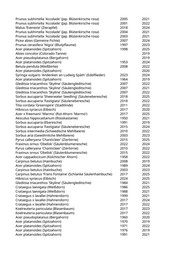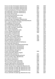 Acer pseudoplatanus (Bergahorn) 1940 2021 Acer platanoides (Spitzahorn) 1947 2024 Koelreuteria paniculata (Blasenbaum) 1982 2019 Hibiscus syriacus (Eibisch) 2013 2020 Hibiscus syriacus (Eibisch) 2020 2024 Ginkgo biloba (Fächerblattbaum) 2001 2022 Tilia x vulgaris (Holländische Linde) 2003 2020 Tilia cordata 'Greenspire' (Stadtlinde) 2015 2024 Crataegus laevigata (Weißdorn) 1980 2019 Hibiscus syriacus (Eibisch) 2009 2020 Fraxinus ornus 'Obelisk' (Säulenblumenesche) 2020 2022 Hibiscus syriacus (Eibisch) 2007 2022 Sorbus aucuparia 'Sheerwater Seedling' (Säuleneberesche) 2016 2025 Cercis siliquastrum (Judasbaum) 2023 2024 Paulownia tomentosa (Blauglockenbaum) 2018 2019 Malus 'Evereste' (Zierapfel) 2007 2025 Carpinus betulus (Hainbuche) 2010 2022 Davidia involucrata (Taubenbaum) 2019 2023 Prunus cerasus (Sauerkirsche) 2020 Acer campestre 'Nanum' (Kugelfeldahorn) 2013 2024 Pyrus calleryana 'Chanticleer' (Zierbirne) 2020 Pyrus calleryana 'Aristocrat' (Zierbirne) 2013 2024 Prunus cerasifera 'Nigra' (Blutpflaume) 2006 2024 Prunus cerasifera 'Nigra' (Blutpflaume) 2007 2024 Prunus cerasifera 'Nigra' (Blutpflaume) 2011 2024 Prunus cerasifera 'Nigra' (Blutpflaume) 2011 2024 Acer pseudoplatanus (Bergahorn) 2022 Quercus frainetto (Ungarische Eiche) 2023 2024 Amelanchier spec. (Felsenbirne) 2019 Liriodendron tulipifera 'Fastigiatum' (Säulentulpenbaum) 2019 Betula pendula (Weißbirke) 2000 2023 Ginkgo biloba (Fächerblattbaum) 2020 Populus balsamifera (Balsam-Pappel) 1972 2022 Populus balsamifera (Balsam-Pappel) 1974 2022 Robinia pseudoacacia (Scheinakazie) 1916 2022 Acer platanoides (Spitzahorn) 2020 Tilia tomentosa (Silberlinde) 2007 2022 Taxus baccata (Heimische Eibe) 1977 2022 Taxus baccata (Heimische Eibe) 1979 2022 Prunus cerasifera 'Nigra' (Blutpflaume) 2002 2020 Tilia x vulgaris (Holländische Linde) 1959 2022 Tilia tomentosa (Silberlinde) 2007 2022 Tilia tomentosa (Silberlinde) 2007 2022 Fraxinus excelsior (Gemeine Esche) 1965 2023 Ulmus 'New Horizon' (Resista Ulme) 2016 2019 Acer platanoides 'Eurostar' (Spitzahorn) 2005 2020 Fagus sylvatica 'Dawyk Purple' (Rotblättrige Säulenblutbuche) 2012 2019 Amelanchier lamarckii (Kupfer-Felsenbirne) 2018 2024 Koelreuteria paniculata 'Fastigiata' (Säulenblasenbaum) 2017 2024 Koelreuteria paniculata 'Fastigiata' (Säulenblasenbaum) 2017 2024 Prunus serrulata 'Amanogawa' (Säulenkirsche) 2006 2020