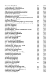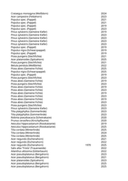 Tilia cordata (Winterlinde) 2014 2021 Prunus sargentii (Scharlachkirsche) 2018 2023 Gleditsia triacanthos (Lederhülsenbaum) 2000 2024 Populus simonii (Birkenpappel) 1995 2021 Carpinus betulus 'Fastigiata' (Säulenhainbuche) 2022 2023 Carpinus betulus 'Fastigiata' (Säulenhainbuche) 2020 2020 Populus simonii (Birkenpappel) 1980 2021 Carpinus betulus 'Fastigiata' (Säulenhainbuche) 2020 2020 Acer platanoides (Spitzahorn) 2000 2024 Aesculus hippocastanum 'Pyramidalis' (Pyramidenkastanie) 1990 2021 Elaeagnus angustifolia (Ölweide) 2019 Malus spec. (Apfelbaum) 2006 2022 Sorbus aucuparia 'Sheerwater Seedling' (Säuleneberesche) 2017 2024 Sorbus aucuparia 'Sheerwater Seedling' (Säuleneberesche) 2017 2022 Malus spec. (Apfelbaum) 2006 2022 Malus spec. (Apfelbaum) 2006 2022 Malus spec. (Apfelbaum) 2006 2022 Malus spec. (Apfelbaum) 2006 2024 Platanus x acerifolia 'Tremonia' (Schmalkronige Platane) 2017 2021 Ulmus minor (Feldulme) 1955 2021 Acer pseudoplatanus (Bergahorn) 1965 2023 Robinia pseudoacacia (Scheinakazie) 1965 2021 Malus sylvestris (Holzapfel) 1990 2022 Populus x canescens (Graupappel) 1915 2024 Prunus avium (Vogelkirsche) 1990 2025 Prunus avium (Vogelkirsche) 2005 2024 Populus x canescens (Graupappel) 1955 2020 Pyrus communis 'Beech Hill' (Wildbirne) 2005 2022 Pyrus communis 'Beech Hill' (Wildbirne) 2005 2020 Ulmus minor (Feldulme) 1985 2023 Fraxinus excelsior 'Westhofs Glorie' (Esche) 2016 2022 Fraxinus pennsylvanica (Rotesche) 1985 2023 Acer platanoides (Spitzahorn) 1990 2019 Fraxinus excelsior (Gemeine Esche) 2005 2020 Prunus avium (Vogelkirsche) 2005 2023 Fraxinus excelsior 'Westhofs Glorie' (Esche) 2016 2024 Acer pseudoplatanus (Bergahorn) 1985 2023 Acer pseudoplatanus (Bergahorn) 1985 2021 Fagus sylvatica (Rotbuche) 2007 2021 Betula pendula (Weißbirke) 1990 2020 Betula pendula (Weißbirke) 1985 2020 Betula pendula (Weißbirke) 1990 2020 Populus nigra (Schwarzpappel) 2020 Populus tremula (Zitterpappel) 2023 2024 Malus spec. (Apfelbaum) 2025 Juglans regia (Walnussbaum) 2021 Quercus macrantheram (Persische Eiche) 2023 2025 Acer platanoides 'Crimson King' (Blutahorn) 2021 2022 Acer platanoides 'Crimson King' (Blutahorn) 2021 2022 Populus nigra (Schwarzpappel) 2021 Acer campestre (Feldahorn) 2023