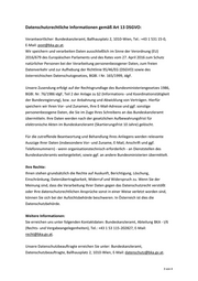 3 von 4 Datenschutzrechtliche Informationen gemäß Art 13 DSGVO: Verantwortlicher: Bundeskanzleramt, Ballhausplatz 2, 1010-Wien, Tel.: +43 1 531 15-0, E-Mail: post@bka.gv.at. Wir speichern und verarbeiten Daten ausschließlich im Sinne der Verordnung (EU) 2016/679 des Europäischen Parlaments und des Rates vom 27. April 2016 zum Schutz natürlicher Personen bei der Verarbeitung personenbezogener Daten, zum freien Datenverkehr und zur Aufhebung der Richtlinie 95/46/EG (DSGVO) sowie des österreichischen Datenschutzgesetzes, BGBl. I Nr. 165/1999, idgF. Unsere Zusendung erfolgt auf der Rechtsgrundlage des Bundesministeriengesetzes 1986, BGBl. Nr. 76/1986 idgF, Teil 2 der Anlage zu §2 (Informations- und Koordinationstätigkeit der Bundesregierung), bzw. zur Anbahnung und Abwicklung von Verträgen. Hierfür speichern wir Ihren Vor- und Zunamen, Ihre E-Mail-Adresse und ggf. sonstige personenbezogene Daten, die Sie im Zuge Ihres Schreibens an das Bundeskanzleramt übermitteln. Ihre Daten werden nach der gesetzlichen Aufbewahrungsfrist für elektronische Akten im Bundeskanzleramt (Skartierungsfrist 10 Jahre) gelöscht. Für die zutreffende Beantwortung und Behandlung Ihres Anliegens werden relevante Auszüge Ihrer Daten (insbesondere Vor- und Zuname, E-Mail, Anschrift und ggf. Telefonnummern) - wenn organisationstechnisch erforderlich - an Dienststellen des Bundeskanzleramts weitergeleitet, sowie ggf. an andere Bundesministerien übermittelt. Ihre Rechte: Ihnen stehen grundsätzlich die Rechte auf Auskunft, Berichtigung, Löschung, Einschränkung, Datenübertragbarkeit, Widerruf und Widerspruch zu. Wenn Sie der Meinung sind, dass die Verarbeitung Ihrer Daten gegen das Datenschutzrecht verstößt oder Ihre datenschutzrechtlichen Ansprüche sonst in einer Weise verletzt worden sind, können Sie sich bei der Aufsichtsbehörde beschweren. In Österreich ist dies die Datenschutzbehörde. Weitere Informationen: Sie erreichen uns unter folgenden Kontaktdaten: Bundeskanzleramt, Abteilung BKA - I/6 (Rechts- und Vergabeangelegenheiten), Tel.: +43 1 53 115-202827, E-Mail: recht@bka.gv.at. Unsere Datenschutzbeauftragte erreichen Sie unter: Bundeskanzleramt, Datenschutzbeauftragte, Ballhausplatz 2, 1010-Wien, E-Mail: datenschutz@bka.gv.at.
