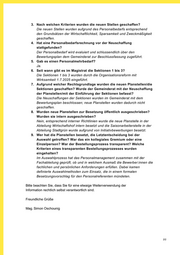 2/2 3. Nach welchen Kriterien wurden die neuen Stellen geschaffen? Die neuen Stellen wurden aufgrund des Personalbedar fs entsprechend den Grundsätzen der Wirtschaftlichkeit, Sparsamkeit und Zweckmäßigkeit geschaffen. 4. Hat eine Personalbedarfsrechnung vor der Neuscha ffung stattgefunden? Der Personalbedarf wird evaluiert und schlussendlic h über den Bewertungsplan dem Gemeinderat zur Beschlussfassung zugeführt. 5. Gab es einen Personalmehrbedarf? Ja. 6. Seit wann gibt es im Magistrat die Sektionen 1 b is 3? Die Sektionen 1 bis 3 wurden durch die Organisation sreform mit Wirksamkeit 1.7.2025 eingeführt. 7. Aufgrund welcher Rechtsgrundlage wurden die neue n Planstellen/die Sektionen geschaffen? Wurde der Gemeinderat mit der Neuschaffung der Planstellen/mit der Einführung der Sektionen be fasst? Die Neuschaffungen der Sektionen wurden im Gemeinde rat mit dem Bewertungsplan beschlossen; neue Planstellen wurden dadurch nicht geschaffen. 8. Wurden neue Planstellen zur Besetzung öffentlich ausgeschrieben? Wurden sie intern ausgeschrieben? Nein, entsprechend interner Richtlinien wurde die n eue Planstelle in der Abteilung Wirtschaftshof intern besetzt und die Sai sonarbeiterstelle in der Abteilung Stadtgrün wurde aufgrund von Initiativbew erbungen besetzt. 9. Wer hat die Planstellen besetzt, die Letztentsch eidung bei der Auswahl getroffen? War das ein kollegiales Gremium oder eine Einzelperson? War der Bestellungsprozess transparen t? Welche Kriterien eines transparenten Bestellungsprozesses wurden eingehalten? Im Auswahlprozess hat das Personalmanagement zusamm en mit der Fachabteilung geprüft, ob und in welchem Ausmaß die Bewerber:innen die fachlichen und persönlichen Anforderungen erfüllen. Dabei kamen definierte Auswahlmethoden zum Einsatz, die in eine m formalen Besetzungsvorschlag für den Personalreferenten münd eten. Bitte beachten Sie, dass Sie für eine etwaige Weiterverwendung der Information rechtlich selbst verantwortlich sind. Freundliche Grüße Mag. Simon Oschounig