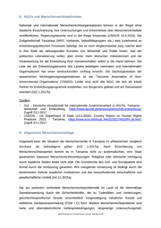 .BFA Bundesamt für Fremdenwesen und Asyl Seite 12 von 25 8. NGOs und Menschenrechtsaktivisten Nationale und internationale Menschenrechtsorganisationen können in der Regel ohne staatliche Einschränkung, ihre Untersuchungen und Erkenntnisse über Menschenrechtsfälle veröffentlichen. Regierungsbeamte sind in der Regel kooperativ (USDOS 13.4.2016). Die Zivilgesellschaft Tansanias (NRO, Verbände, Selbsthilfegruppen, etc.) wird zunehmend an entwicklungspolitischen Prozessen beteiligt. Sie ist noch vergleichsweise jung, wächst aber in ihre Rolle als wirkungsvolles Korrektiv von Wirtschaft und Politik hinein. Seit der politischen Liberalisierung wollen aber immer mehr Menschen mitbestimmen und die Verantwortung für die Entwicklung ihrer Gemeinschaften selbst in die Hand nehmen. Die Liste der am Entwicklungsprozess des Landes beteiligten nationalen und internationalen Organisationen hat einen eindrucksvollen Umfang erreicht. Die Dachorganisation der tansanischen Nichtregierungsorganisationen ist die 'Tanzania Association of Non- Governmental Organizations' (TANGO). Leider sind nicht alle NGO, die sich als lokale Partner für Entwicklungsprogramme empfehlen, von Bürgersinn geleitet und am Gemeinwohl orientiert (GIZ 1.2017b). Quellen: - GIZ – Deutsche Gesellschaft für internationale Zusammenarbeit (1.2017b): Tansania - Wirtschaft und Entwicklung, https://www.liportal.de/tansania/wirtschaft-entwicklung/, Zugriff 23.2.2017 - USDOS - US Department of State (13.4.2016): Country Report on Human Rights Practices 2015 - Tanzania, https://www.ecoi.net/local_link/322617/462094_de.html, Zugriff 23.2.2017 9. Allgemeine Menschenrechtslage Insgesamt kann die Situation der Menschenrechte in Tansania im afrikanischen Vergleich durchaus als befriedigend gelten (GIZ 1.2017a). Nach Einschätzung von Menschenrechtsexperten kommt es in Tansania nicht zu systematischen, vom Staat gesteuerten massiven Menschenrechtsverletzungen. Religiöse oder ethnische Verfolgung durch staatliche Stellen findet nicht statt. Die Grundrechte des Zivil- und Sozialpaktes sind formal durch die Verfassung garantiert. Ihre mangelnde Umsetzung ist bedingt durch die bestehenden Defizite staatlicher Institutionen und das herausfordernde wirtschaftliche und gesellschaftliche Umfeld (AA 11.2015a). Die am weitesten verbreitete Menschenrechtsproblematik im Land ist die übermäßige Gewaltanwendung durch die Sicherheitskräfte, die zu Todesfällen und Verletzungen, geschlechtsspezifischer Gewalt, einschließlich Vergewaltigung, häuslicher Gewalt und weiblicher Genitalverstümmelung (FGM / C) führt. Weitere Menschenrechtsprobleme sind harte und lebensbedrohliche Gefängnisbedingungen, langwierige Untersuchungshaft,