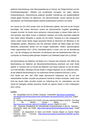 .BFA Bundesamt für Fremdenwesen und Asyl Seite 13 von 25 politische Einschränkung, freie Meinungsäußerung im Internet, der Religionsfreiheit und der Flüchtlingsbewegungen. Offizielle und bundesweite Korruption auf vielen Ebenen, Kindesmissbrauch, Diskriminierung aufgrund sexueller Orientierung und gesellschaftliche Gewalt gegen Personen mit Albinismus. Der Menschenhandel, sowohl national als auch international, und Kinderarbeit bleiben weiterhin problematisch (USDOS 13.4.2016). Von Januar bis Juni 2015 wurden mehr als 50 Menschen getötet, weil man sie der Hexerei bezichtigte. 350 weitere Menschen wurden bei dokumentierten Angriffen gewalttätiger Gruppen ermordet. Es fanden keine wirksamen Untersuchungen zu diesen Fällen statt. Es wird berichtet, dass ältere Frauen in ländlichen Gebieten und Kinder besonders gefährdet sind, Opfer solcher Übergriffe zu werden (AI 24.2.2016). Tansania ist in den vergangenen Jahren zudem immer wieder wegen grausamer Morde an Menschen mit Albinismus in die Schlagzeilen geraten. Albinismus wird hier einerseits vielfach als Makel (sogar als Fluch) betrachtet, andererseits werden ihm von einigen traditionellen "Heilern" glücksbringende Kräfte zugeschrieben (GIZ 1.207a). Gewaltakte gehen in erster Linie von der Bevölkerung aus – wie die Verfolgung von Menschen mit Albinismus oder die wiederkehrenden Fälle von Lynchjustiz zur Ahndung selbst geringer Vergehen (z.B. Diebstahl) zeigen (AA 11.2015a). Die Beschneidung von Mädchen und Buben ist in Tansania weit verbreitet. Seit 1998 ist die Beschneidung von Mädchen als Menschenrechtsverletzung anerkannt und unter Strafe gestellt. In Tansania sind 15 Prozent der Mädchen und Frauen zwischen 15 und 49 Jahren von FGM betroffen. Allerdings sind die Anteile in einigen Regionen um ein Vielfaches höher, da die weibliche Beschneidung nur von bestimmten Ethnien praktiziert wird (GIZ 1.207a). Eine Studie aus dem Jahr 2009 zeigte alarmierende Ergebnisse auf, die auf eine weitverbreitete mentale, sexuelle und physische Gewalt an Kindern hinweisen. Jedes vierte Kind war bereits Opfer sexueller Gewalt vor Vollendung des 18. Lebensjahres und drei Viertel der Befragten erlebten physische Gewalt am eigenen Körper in ihren Kinderjahren (GIZ 1.207a). Quellen: - AA - Auswärtiges Amt (11.2015a): Tansania - Innenpolitik, http://www.auswaertiges- amt.de/DE/Laenderinformationen/00-SiHi/Nodes/TansaniaSicherheit_node.html, Zugriff 22.2.2017 - AI - Amnesty International (24.2.2016): Amnesty International Report 2015/16 - The State of the World's Human Rights - Tanzania, http://www.ecoi.net/local_link/319711/466565_de.html, Zugriff 22.2.2017 - GIZ - Deutsche Gesellschaft für Internationale Zusammenarbeit (1.2017a): Tansania - Geschichte, Staat und Politik, https://www.liportal.de/tansania/geschichte-staat/, Zugriff 21.2.2017 - USDOS - US Department of State (13.4.2016): Country Report on Human Rights Practices 2015 - Tanzania, https://www.ecoi.net/local_link/322617/462094_de.html, Zugriff 23.2.2017