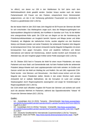 .BFA Bundesamt für Fremdenwesen und Asyl Seite 7 von 25 'ex officio'), von denen nur 239 in den Wahlkreisen für fünf Jahre nach dem Mehrheitswahlrecht direkt gewählt werden. Darüber hinaus wurden nach der letzten Parlamentswahl 102 Frauen von den Parteien, entsprechend ihrem Stimmenanteil, aufgenommen, um den in der Verfassung geforderten Frauenanteil von mindestens 30 Prozent zu gewährleisten (GIZ 1.2017a). Bei der letzten Wahl im Jahr 2015 hatte John Magufuli mit 58 Prozent der Stimmen die Wahl für sich entschieden. Das Wahlergebnis zeigte auch, dass die Religionszugehörigkeit von Spitzenpolitikern (Magufuli ist Katholik), den Konflikten in Sansibar zum Trotz, für die Wähler eine untergeordnete Rolle spielt. Die CCM war von Beginn an bei der Nominierung der Präsidentschaftskandidaten um Ausgleich bemüht: Nyerere und Mkapa (erster und dritter Präsident), als Mitglieder der katholischen Kirche, wurden abgelöst von den Muslimen Mwinyi und Kikwete (zweiter und vierter Präsident). Der amtierende Präsident John Magufuli ist dementsprechend Christ. Seit seinem Amtsantritt machte Magufuli Schlagzeilen mit einem konsequenten Kurs gegen Korruption, Armut und staatliche Ineffizienz und bekam international und national viel Anerkennung. Jedoch wurden kürzlich auch Einwände von Aktivisten laut, die sein Vorgehen gegen Kritiker seiner Politik anprangern (GIZ 1.2017a). Am 25. Oktober 2015 fand in Tansania die Wahl für einen neuen Präsidenten, ein neues Parlament und neue Stadt- und Gemeinderäte statt. Auf dem Festland durfte der amtierende Präsident Jakaya Kikwete nach zwei Legislaturperioden nicht mehr antreten. Im Großen und Ganzen verlief dort die Wahl am Wahltag fair und friedlich. Die seit 1961 regierende CCM- Partei konnte - trotz Stimmen- und Sitzverlusten - ihre Macht erneut sichern und mit John Magufuli den neuen Präsidenten stellen. Bereits in den ersten Wochen nach seinem Amtsantritt traf er radikale Maßnahmen, die die Korruption im Land und unnötige Staatsausgaben durch Regierungsbeamte anprangerten und sorgte für Veränderungen in Regierungsabläufen (GIZ 1.2017a). Die CCM erhielt nach offiziellen Angaben 58 Prozent der Stimmen und sicherte sich somit auch die absolute Mehrheit im Parlament, während das Oppositionsbündnis "Ukawa" 40 Prozent der Stimmen bekam (GIZ 1.2017a). Quellen: - AA - Auswärtiges Amt (11.2015): Tansania - Übersichtsseite http://www.auswaertiges- amt.de/DE/Aussenpolitik/Laender/Laenderinfos/01-Laender/Tansania.html?nnm=383178, Zugriff 21.2.2017 - AA - Auswärtiges Amt (11.2015a): Tansania - Innenpolitik, http://www.auswaertiges- amt.de/DE/Aussenpolitik/Laender/Laenderinfos/Tansania/Innenpolitik_node.html, Zugriff 21.2.2017 - GIZ - Deutsche Gesellschaft für Internationale Zusammenarbeit (1.2017a): Tansania - Geschichte, Staat und Politik, https://www.liportal.de/tansania/geschichte-staat/, Zugriff 21.2.2017