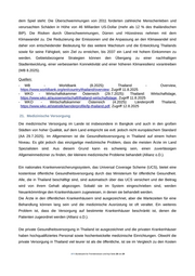 dem Spiel steht: Die Überschwemmungen von 2011 forderten zahlreiche Menschenleben und verursachten Schäden in Höhe von 46 Milliarden US-Dollar (mehr als 12 % des thailändischen BIP). Die Risiken durch Überschwemmungen, Dürren und Hitzestress nehmen mit dem Klimawandel zu. Die Reduzierung der Emissionen und die Anpassung an den Klimawandel sind daher von entscheidender Bedeutung für das weitere Wachstum und die Entwicklung Thailands sowie für seine Fähigkeit, sein Ziel zu erreichen, bis 2037 ein Land mit hohem Einkommen zu werden. Gebietsbezogene Strategien können den Übergang zu einer nachhaltigen Stadtentwicklung, einer verbesserten Konnektivität und einer höheren Klimaresilienz vorantreiben (WB 8.2025). Quellen: - WB - Worldbank (8.2025): Thailand - Overview, https://www.worldbank.org/en/country/thailand/overview; Zugriff 11.8.2025 - WKO - Wirtschaftskammer Österreich (29.7.2025): Thailand: Wirtschaftslage, https://www.wko.at/aussenwirtschaft/thailand-wirtschaftslage, Zugriff 11.8.2025 - WKO - Wirtschaftskammer Österreich (4.2025): Länderprofil Thailand, https://www.wko.at/statistik/laenderprofile/lp-thailand.pdf, Zugriff 12.8.2025 21. Medizinische Versorgung Die medizinische Versorgung im Lande ist insbesondere in Bangkok und auch in den großen Städten von hoher Qualität, auf dem Land entspricht sie evtl. jedoch nicht europäischem Standard (AA 29.7.2025). Im Allgemeinen ist die Gesundheitsversorgung in Thailand auf einem hohen Niveau. Es gibt jedoch das einzigartige medizinische Problem, dass die meisten Ärzte im Land Spezialisten sind. Aus diesem Grund kann es schwierig sein, einen zuverlässigen Allgemeinmediziner zu finden, der kleinere medizinische Probleme behandelt (Allianz o.D.). Ein nationales Krankenversicherungssystem, das Universal Coverage Scheme (UCS), bietet eine kostenlose öffentliche Gesundheitsversorgung durch das Ministerium für öffentliche Gesundheit. Alle, die in Thailand beschäftigt sind, sind automatisch über das UCS versichert und der Beitrag wird von ihrem Gehalt abgezogen. Sobald sie im System eingeschrieben sind, werden Neuankömmlinge den Krankenhäusern zugewiesen, in denen sie behandelt werden. Die Ärzte in den öffentlichen Krankenhäusern sind ausgezeichnet, aber die Wartezeiten für eine Behandlung können lang sein und die medizinische Ausrüstung ist oft veraltet. Ein weiteres Problem ist, dass die Versorgung auf bestimmte Krankenhäuser beschränkt ist, denen die Patienten zugeordnet werden (Allianz o.D.). Die private Gesundheitsversorgung in Thailand ist ausgezeichnet und die privaten Krankenhäuser haben hochqualifiziertes Personal sowie hochentwickelte medizinische Einrichtungen. Obwohl die private Versorgung in Thailand viel teurer ist als die öffentliche, ist sie im Vergleich zu den Kosten .BFA Bundesamt für Fremdenwesen und Asyl Seite 28 von 29