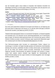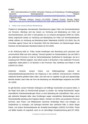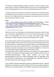 Das UN Committee against Torture äußerte im November 2024 Bedenken hinsichtlich der übermäßigen Anwendung von Gewalt gegen friedliche Demonstranten sowie der physischen und digitalen Gewalt gegen Menschenrechtsverteidiger (AI 29.4.2024). Quellen: - AI - Amnesty International (29.4.2025): The State of the World's Human Rights; Thailand 2024, https://www.ecoi.net/de/dokument/2124685.html, Zugriff 30.6.2025 - FH - Freedom House (2025): Freedom in the World 2025 - Thailand, https://freedomhouse.org/country/thailand/freedom-world/2025, Zugriff 30.6.2025 - HRW - Human Rights Watch (16.1.2025): World Report 2025 - Thailand, https://www.ecoi.net/de/dokument/2120123.html, Zugriff 1.7.2025 - USDOS - U.S. Department of State [USA] (23.4.2024): 2023 Country Report on Human Rights Practices: Thailand, https://www.ecoi.net/de/dokument/2107649.html, Zugriff 1.7.2025 7. Korruption Das Gesetz sieht strafrechtliche Sanktionen für Korruption durch Beamte vor; die Regierung setzt das Gesetz jedoch im Allgemeinen nicht wirksam um. Im Laufe des Jahres 2023 gab es zahlreiche Berichte über Korruption in der Regierung (USDOS 23.4.2024). Thailands Antikorruptionsgesetze werden nur unzureichend durchgesetzt, und Bestechungsgelder und Geschenke sind in der Wirtschaft, bei den Strafverfolgungsbehörden und im Rechtssystem gang und gäbe. Die Nationale Antikorruptionskommission wird zunehmend dazu genutzt, politisch motivierte Verfahren einzuleiten, darunter Ermittlungen gegen oppositionelle Abgeordnete wegen ihrer Unterstützung für eine Reform des Majestätsbeleidigungsgesetzes (FH 2025). Trotz Reformanstrengungen bleibt Korruption ein weitverbreitetes Problem. Aufgrund von Verwicklungen in Korruption und illegale Geschäfte genießen die thailändischen Sicherheitskräfte allerdings einen durchaus zweifelhaften Ruf (BICC 12.2024). Kleinkorruption und Bestechlichkeit sind bei der Polizei weit verbreitet (USDOS 23.4.2024). Bemühungen der thailändischen Regierung, Korruption, Menschenhandel und jeglichen Schmuggel unter Kontrolle zu bringen, werden unter anderem dadurch behindert, dass Mitglieder der Sicherheitskräfte am Menschenhandel beteiligt sind bzw. gegen Annahme von Bestechungsgeldern beim Schmuggel behilflich sind (BICC 12.2024). Quellen: - BICC Informationsdienst (12.2024): Sicherheit, Rüstung und Entwicklung in Empfängerländern deutscher Rüstungsexporte - Thailand, https://www.ruestungsexport.info/user/pages/04.laenderberichte/thailand/2024_Thailand.pdf, Zugriff 1.7.2025 - FH - Freedom House (2025): Freedom in the World 2025 - Thailand, https://freedomhouse.org/country/thailand/freedom-world/2025, Zugriff 1.7.2025 - USDOS - U.S. Department of State [USA] (23.4.2024): 2023 Country Report on Human Rights Practices: Thailand, https://www.ecoi.net/de/dokument/2107649.html, Zugriff 1.7.2025 .BFA Bundesamt für Fremdenwesen und Asyl Seite 11 von 29