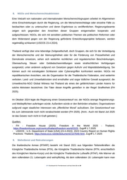 8. NGOs und Menschenrechtsaktivisten Eine Vielzahl von nationalen und internationalen Menschenrechtsgruppen arbeitet im Allgemeinen ohne Einschränkungen durch die Regierung, um die Menschenrechtslage oder einzelne Fälle zu beobachten oder zu untersuchen und deren Ergebnisse zu veröffentlichen. Regierungsbeamte zeigen sich gegenüber den Ansichten dieser Gruppen einigermaßen kooperativ und aufgeschlossen. NGOs, die sich mit sensiblen politischen Themen wie politischen Reformen oder dem Widerstand gegen von der Regierung geförderte Entwicklungsprojekte befassen, werden regelmäßig schikaniert (USDOS 23.4.2024). Thailand verfügt über eine lebendige Zivilgesellschaft, doch Gruppen, die sich für die Verteidigung der Menschenrechte und der Meinungsfreiheit oder für die Förderung von Pressefreiheit und Demokratie einsetzen, sehen sich weiterhin rechtlichen und regulatorischen Beschränkungen, Überwachung, Steuer- oder Geldwäscheermittlungen sowie strafrechtlichen Verfolgungen ausgesetzt, unter anderem aufgrund von Gesetzen gegen Aufruhr und Majestätsbeleidigung. Sie können auch mit extralegalen Schikanen oder Cyberangriffen konfrontiert werden. NGOs mit republikanischen Ansichten, wie die Organisation für die Thailändische Föderation, sind weiterhin verboten. Land- und Umweltaktivisten sind ernsthafter und sogar tödlicher Gewalt ausgesetzt; die Umweltrechts-NGO Global Witness hat Thailand als eines der gefährlichsten Länder Asiens für solche Aktivisten bezeichnet. Die Täter dieser Angriffe genießen in der Regel Straffreiheit (FH 2025). Im Oktober 2024 legte die Regierung einen Gesetzentwurf vor, der NGOs strenge Registrierungs- und Meldepflichten auferlegen würde. Außerdem würde er den Behörden erlauben, Organisationen aufgrund vager staatlicher Interessen wie „öffentlicher Moral” aufzulösen. Der Gesetzentwurf war bis zum Jahresende noch nicht verabschiedet worden (FH 2025). [Anm.: Auch mit Stand Juli 2025 ist das Gesetz noch nicht in Kraft getreten.] Quellen: - FH - Freedom House (2025): Freedom in the World 2025 - Thailand, https://freedomhouse.org/country/thailand/freedom-world/2025, Zugriff 1.7.2025 - USDOS - U.S. Department of State [USA] (23.4.2024): 2023 Country Report on Human Rights Practices: Thailand, https://www.ecoi.net/de/dokument/2107649.html, Zugriff 1.7.2025 9. Wehrdienst und Rekrutierungen Die thailändische Armee (RTARF) besteht mit Stand 2021 aus folgenden Teilstreitkräften: die Königliche Thailändische Armee (RTA), die Königliche Thailändische Marine (RTN, einschließlich des Königlichen Marine-Korps) und die Königliche Thailändische Luftwaffe (RTAF). Alle Männer ab dem vollendeten 21. Lebensjahr sind wehrpflichtig. Ab dem vollendeten 18. Lebensjahr kann man .BFA Bundesamt für Fremdenwesen und Asyl Seite 12 von 29
