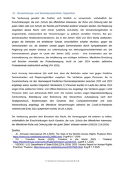 12. Versammlungs- und Vereinigungsfreiheit, Opposition Die Verfassung gewährt die Freiheit, sich friedlich zu versammeln, vorbehaltlich der Einschränkungen, die zum „Schutz des öffentlichen Interesses, der Ruhe und Ordnung oder der guten Sitten oder zum Schutz der Rechte und Freiheiten anderer“ erlassen werden. Die Regierung respektiert dieses Recht nicht immer (USDOS 23.4.2024). Die Versammlungsfreiheit ist eingeschränkt, insbesondere bei Versammlungen zu politisch sensiblen Themen. Bei pro- demokratischen Straßendemonstrationen, die in den Jahren 2020 und 2021 häufig stattfanden, gingen die Behörden mit erheblicher Gewalt, einschließlich scharfer Munition, gegen die Demonstranten vor; sie duldeten Gewalt gegen Demonstranten durch Sympathisanten der Regierung und setzten Gesetze zur Unterdrückung von Meinungsverschiedenheiten ein. Die Demonstrationen gingen im Laufe des Jahres 2022 zurück - eine Kombination aus der Kriminalisierung von Aktivismus, der Inhaftierung von wichtigen Anführern, öffentlicher Ermüdung und Brüchen innerhalb der Protestbewegung. Auch im Jahr 2024 wurden zahlreiche Protestierende strafrechtlich verfolgt (FH 2025). Auch Amnesty International (AI) stellt fest, dass die Behörden weiter hart gegen friedliche Demonstranten und Regierungskritiker vorgehen. Die Verfahren gegen Personen, die im Zusammenhang mit den überwiegend friedlichen Demokratieprotesten zwischen 2020 und 2023 angeklagt waren, wurden fortgesetzt. Mindestens 22 Personen wurden im Laufe des Jahres 2024 wegen ihres politischen Online- und Offline-Aktivismus neu angeklagt. Die Verfahren gegen 1.256 Personen liefen zum Jahresende 2024 noch. Die meisten wurden wegen Majestätsbeleidigung (Verleumdung, Beleidigung oder Bedrohung des Monarchen), Aufwiegelung nach dem Strafgesetzbuch, Bestimmungen des Gesetzes über Computerkriminalität und einer Notverordnung angeklagt, die öffentliche Versammlungen während der Covid-19-Pandemie verbietet (die Ende 2022 aufgehoben wurde) (AI 29.4.2025). Die Verfassung gewährt dem Einzelnen das Recht, frei Vereinigungen mit anderen zu bilden, vorbehaltlich der Einschränkungen durch Gesetze, die zum „Schutz des öffentlichen Interesses, der öffentlichen Ruhe und Ordnung oder der guten Sitten“ erlassen werden (USDOS 23.4.2024). Quellen: - AI - Amnesty International (29.4.2025): The State of the World's Human Rights; Thailand 2024, https://www.ecoi.net/de/dokument/2124685.html, Zugriff 14.7.2025 - FH - Freedom House (2025): Freedom in the World 2025 - Thailand, https://freedomhouse.org/country/thailand/freedom-world/2025, Zugriff 8.7.2025 - USDOS - U.S. Department of State [USA] (23.4.2024): 2023 Country Report on Human Rights Practices: Thailand, https://www.ecoi.net/de/dokument/2107649.html, Zugriff 7.7.2025 .BFA Bundesamt für Fremdenwesen und Asyl Seite 16 von 29