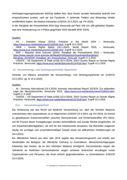Nichtregierungsorganisationen (NGOs) stellten fest, dass Nutzer sozialer Netzwerke bedroht und eingeschüchtert wurden, weil sie auf Facebook, X (ehemals Twitter) und WhatsApp Inhalte veröffentlicht hatten, die Maduro kritisierten (USDOS 23.4.2024; vgl. FH 2024). In der Rangliste der Pressefreiheit 2024 liegt Venezuela auf Platz 156 von 180 gelisteten Staaten, was eine Verbesserung um 3 Plätze gegenüber 2023 darstellt (RSF 2024). Quellen: - FH – Freedom House (2024): Freedom in the World 2024 – Venezuela, https://www.ecoi.net/de/dokument/2105035.html, Zugriff 14.2.2025 - HRW – Human Rights Watch (16.1.2025): World Report 2025 – Venezuela, https://www.ecoi.net/de/dokument/2120046.html, Zugriff 14.2.2025 - RSF – Reporter ohne Grenzen (2024): Rangliste der Pressefreiheit 2024 – Venezuela, https://www.reporter-ohne-grenzen.de/fileadmin/Redaktion/Downloads/Ranglisten/ Rangliste_2024/RSF_Rangliste_der_Pressefreiheit_2024.pdf, Zugriff 17.2.2025 - USDOS – US Department of State [USA] (23.4.2024): 2023 Country Report on Human Rights Practices: Venezuela, https://www.ecoi.net/de/dokument/2107618.html, Zugriff 13.2.2025 12. Versammlungs- und Vereinigungsfreiheit, Opposition Vertreter von Maduro schränkten die Versammlungs- und Vereinigungsfreiheit ein (USDOS 23.4.2024; vgl. AI 24.4.2024). Quellen: - AI – Amnesty International (24.4.2024): Amnesty International Report 2023/24; Zur weltweiten Lage der Menschenrechte; Venezuela 2023, https://www.ecoi.net/de/dokument/2108020.html, Zugriff 17.2.2025 - USDOS – US Department of State [USA] (23.4.2024): 2023 Country Report on Human Rights Practices: Venezuela, https://www.ecoi.net/de/dokument/2107618.html, Zugriff 13.2.2025 12.1. Versammlungsfreiheit Die Verfassung sah das Recht auf friedliche Versammlung vor, aber die Vertreter Maduros unterdrückten oder suspendierten es im Allgemeinen (USDOS 23.4.2024; vgl. FH 2024). Es kommt zu gewaltsamen Zusammenstößen zwischen Demonstranten und Sicherheitskräften (FH 2024). Auf 80 Prozent dieser Kundgebungen wurden wirtschaftliche und soziale Rechte eingefordert, oft von Gewerkschaftsmitgliedern, die sich für ihre Arbeitsrechte einsetzten. Die Behörden reagierten häufig mit unnötiger und unverhältnismäßiger Gewalt sowie mit willkürlichen Inhaftierungen (AI 24.4.2024). Ein öffentliches Dekret aus dem Jahr 2015 regelte das Versammlungsrecht und erteilte den Streitkräften die Befugnis, die öffentliche Ordnung zu kontrollieren. Menschenrechtsgruppen kritisierten das Gesetz, da es den Vertretern Maduros ermöglicht, Demonstranten wegen der Teilnahme an friedlichen Demonstrationen wegen schwerer Verbrechen anzuklagen sowie Organisationen und Personen, die ihnen kritisch gegenüberstehen, zu kriminalisieren (USDOS 23.4.2024). .BFA Bundesamt für Fremdenwesen und Asyl Seite 21 von 41