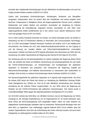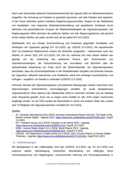 Kontrolle über redaktionelle Entscheidungen bei den öffentlichen Rundfunkanstalten und auch bei einigen privaten Medien ausüben (USDOS 12.4.2022). Zudem sind Journalisten Einschüchterungen, Verhaftungen, Schikanen und Übergriffen ausgesetzt, insbesondere wenn sie kritisch über den Präsidenten und seinen engsten Kreis berichten. Insbesondere in Wahljahren führen die Regierungsbehörden Razzien durch, schließen Radiosender und andere Medien und entziehen Journalisten als Vergeltung für kritische Berichterstattung die Akkreditierung. Insgesamt konnten Journalisten im Jahr 2022 mehr regierungskritische Artikel veröffentlichen als in den Jahren zuvor, obwohl Selbstzensur immer noch eine gängige Praxis ist (FH 10.3.2023). Am 9.1.2022 schloss Facebook Dutzende von Konten, von denen behauptet wurde, sie stünden in Verbindung mit dem ICT-Ministerium (Ministry of Information and Communications Technology). Am 12.1.2022 beschuldigte Präsident Museveni Facebook und andere, sich in den Wahlprozess einzumischen. Der Direktor der UCC wies Telekommunikationsunternehmen an, den Zugang zu und die Nutzung von sozialen Medien und Online-Nachrichtenplattformen unverzüglich auszusetzen. Anbieter wie Airtel und MTN Uganda informierten ihre Abonnenten per SMS über die Aussetzung. Am selben Tag blockierte die Regierung das Internet für fünf Tage (AI 29.3.2022). Die Verfassung sieht die Versammlungsfreiheit vor, jedoch respektiert die Regierung dieses Recht nicht. Sie schränkt das Recht auf friedliche Versammlung und Vereinigungsfreiheit ein und nutzte die COVID-19-Beschränkungen, um Versammlungen und Kundgebungen der politischen Opposition zu blockieren und aufzulösen. Das Versäumnis der Regierung, Angriffe auf Menschenrechtsverteidiger und friedliche Demonstranten zu untersuchen oder strafrechtlich zu verfolgen, führt de facto zu weiteren Einschränkungen dieser Freiheiten (USDOS 12.4.2022). Die Versammlungsfreiheit der politischen Opposition ist in Uganda stark eingeschränkt. Von 2013 bis Anfang 2020 setzte die Polizei das Gesetz zur Verwaltung der öffentlichen Ordnung (Public Order Management Act, POMA) um. Dort ist für jede öffentliche Versammlung eine vorherige Anmeldung bei der örtlichen Polizei vorgeschrieben. Im Juni 2020 verbot die Regierung als Reaktion auf die COVID-19-Pandemie alle politischen Versammlungen. Das Verbot wurde in unverhältnismäßiger Weise gegen die Oppositionsparteien durchgesetzt (FH 10.3.2023). Am 20.8.2022 ordnete das NGO-Büro, ein offizielles Gremium, das für die Regulierung von NGOs zuständig ist, die sofortige Suspendierung von 54 Organisationen an. Es wurde behauptet, dass diese NOGs die NGO-Gesetzgebung nicht eingehalten hätten, indem sie unter anderem mit abgelaufenen Genehmigungen arbeiteten oder es versäumten, Rechenschaft abzulegen oder sich beim Büro zu registrieren. Das unabhängige Uganda National NGO Forum erklärte, dass die meisten Organisationen nicht über die Entscheidung des Amtes informiert wurden und auch keine Gelegenheit zur Stellungnahme erhalten hatten (AI 29.3.2022). .BFA Bundesamt für Fremdenwesen und Asyl Seite 13 von 26