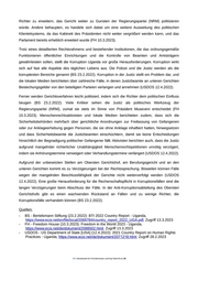 Richter zu erweitern, das Gericht weiter zu Gunsten der Regierungspartei (NRM) politisieren würde. Andere behaupten, es handele sich dabei um eine weitere Ausweitung des politischen Klientelsystems, da das Kabinett des Präsidenten nicht weiter vergrößert werden kann, und das Parlament bereits erheblich erweitert wurde (FH 10.3.2023). Trotz eines detaillierten Rechtsrahmens und bestehender Institutionen, die das ordnungsgemäße Funktionieren öffentlicher Einrichtungen und die Kontrolle von Beamten und Amtsträgern gewährleisten sollen, stellt die Korruption Uganda vor große Herausforderungen. Korruption wirkt sich auf fast alle Aspekte des täglichen Lebens aus. Die Polizei und die Justiz werden als die korruptesten Bereiche genannt (BS 23.2.2022). Korruption in der Justiz stellt ein Problem dar, und die lokalen Medien berichteten über zahlreiche Fälle, in denen Justizbeamte an unteren Gerichten Bestechungsgelder von den beteiligten Parteien verlangen und annehmen (USDOS 12.4.2022). Ferner werden Gerichtsverfahren leicht politisiert, indem sich die Richter dem politischen Einfluss beugen (BS 23.2.2022). Viele Kritiker sehen die Justiz als politisches Werkzeug der Regierungspartei (NRM), zumal sie stets im Sinne von Präsident Museveni entscheidet (FH 10.3.2023). Menschenrechtsaktivisten und lokale Medien berichteten zudem, dass sich die Sicherheitsbehörden mehrfach über gerichtliche Anordnungen zur Freilassung von Gefangenen oder zur Anklageerhebung gegen Personen, die sie ohne Anklage inhaftiert hatten, hinwegsetzen und dass Sicherheitsbeamte die Justizbeamten einschüchtern, damit sie keine Entscheidungen hinsichtlich der Begnadigung politischer Gefangener fällt. Aktivisten berichten auch, dass die Justiz aufgrund mangelnder richterlicher Unabhängigkeit Menschenrechtspetitionen unnötig verzögert, indem sie Anhörungstermine verweigert oder Verhandlungstermine verlängert (USDOS 12.4.2022). Aufgrund der unbesetzten Stellen am Obersten Gerichtshof, am Berufungsgericht und an den unteren Gerichten kommt es zu Verzögerungen bei der Rechtssprechung. Bisweilen können Fälle wegen der mangelnden Beschlussfähigkeit der Gerichte nicht weiterverfolgt werden (USDOS 12.4.2022). Eine große Herausforderung für die Rechenschaftspflicht in Korruptionsfällen sind die langen Verzögerungen beim Abschluss der Fälle. In der Anti-Korruptionsabteilung des Obersten Gerichtshofs gibt es einen wachsenden Rückstand an Fällen und zu wenige Richter, die Korruptionsfälle verhandeln können (BS 23.2.2022). Quellen: -BS - Bertelsmann Stiftung (23.2.2022): BTI 2022 Country Report - Uganda, https://www.ecoi.net/en/file/local/2069784/country_report_2022_UGA.pdf, Zugriff 13.3.2023 -FH - Freedom House (10.3.2023): Freedom in the World 2023 - Uganda, https://www.ecoi.net/de/dokument/2088502.html, Zugriff 13.3.2023 -USDOS - US Department of State [USA] (12.4.2022): 2021 Country Report on Human Rights Practices - Uganda, https://www.ecoi.net/de/dokument/2071218.html, Zugriff 28.2.2023 .BFA Bundesamt für Fremdenwesen und Asyl Seite 9 von 26