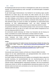 18.2. Kinder Die Staatsbürgerschaft wird durch die Geburt im Hoheitsgebiet des Landes oder von seinen Eltern erworben. Die Geburtenregistrierung wurde unverzüglich und diskriminierungsfrei durchgeführt (USDOS 20.3.2023). Es gibt Gesetze gegen Kindesmissbrauch. Das Strafmaß für die Verurteilung wegen sexuellen Missbrauchs von Kindern liegt je nach Schwere des Falles zwischen zwei und 16 Jahren Gefängnis. Die Strafen für das Verbrechen der Körperverletzung reichen von drei Monaten bis zu acht Jahren Gefängnis, und die Strafe für häusliche Gewalt liegt zwischen sechs Monaten und zwei Jahren Gefängnis. Das INAU hat eine kostenlose, landesweite Hotline eingerichtet. Das zum INAU gehörende System zum Schutz von Kindern und Jugendlichen vor Gewalt (SIPIAV) führte gemeinsam mit NRO Aufklärungskampagnen durch, und SIPIAV koordinierte die behördenübergreifenden Bemühungen um den Schutz der Kinderrechte (USDOS 20.3.2023). Das gesetzliche Mindestalter für die Eheschließung beträgt 16 Jahre, aber das Gesetz verlangt die Zustimmung der Eltern bis zum Alter von 18 Jahren. Das Gesetz definiert Zwangsheirat als eine Form der Ausbeutung (USDOS 20.3.2023). Die kommerzielle sexuelle Ausbeutung, den Verkauf, das Heranziehen oder die Nutzung von Kindern, einschließlich des sexuellen Kinderhandels ist verboten (USDOS 20.3.2023). Nach Angaben der Beobachtungsstelle für geschlechtsspezifische Gewalt und Zugang zur Justiz, wurden mindestens acht Kinder wurden bei Vorfällen im Zusammenhang mit geschlechtsspezifischer Gewalt getötet (AI 27.3.2023). Quellen: - AI – Amnesty International (27.3.2023): Amnesty International Report 2022/23; The State of the World's Human Rights; Uruguay 2022, https://www.ecoi.net/de/dokument/2089666.html, Zugriff 6.6.2023 - USDOS – US Department of State [USA] (20.3.2023): 2022 Country Report on Human Rights Practices: Uruguay, https://www.ecoi.net/de/dokument/2089733.html, Zugriff 12.6.2023 18.3. Sexuelle Minderheiten Homosexuelle haben ähnliche Freiheiten und Rechte wie in Österreich (BMEIA 19.6.2023). Uruguay hat als erstes südamerikanisches Land gleichgeschlechtliche Ehen anerkannt. Die Toleranz gegenüber LGBTIQ ist hoch (AA 19.6.2023). Das Gesetz verbietet die Diskriminierung durch staatliche und nichtstaatliche Akteure aufgrund der sexuellen Ausrichtung, der Geschlechtsidentität oder des Geschlechtsausdrucks oder der Geschlechtsmerkmale und erkennt LGBTQI+ Einzelpersonen, Paare und ihre Familien an. Führende Vertreter zivilgesellschaftlicher Organisationen berichteten, dass trotz der gesetzlichen Förderung der Rechte von LGBTQI+ die gesellschaftliche Diskriminierung weiterhin hoch ist. Die Behörden setzten das Gesetz durch und bemühten sich um den Schutz der Rechte von LGBTQI+- Personen (USDOS 20.3.2023). .BFA Bundesamt für Fremdenwesen und Asyl Seite 16 von 20