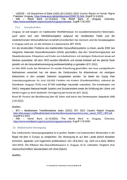 - USDOS – US Department of State [USA] (20.3.2023): 2022 Country Report on Human Rights Practices: Uruguay, https://www.ecoi.net/de/dokument/2089733.html, Zugriff 12.6.2023 - WB – World Bank (3.10.2022): The World Bank In Uruguay, Overview, https://www.worldbank.org/en/country/uruguay/overview, Zugriff 13.6.2023 21.1. Sozialbeihilfen Uruguay ist seit langem ein traditioneller Wohlfahrtsstaat mit sozialdemokratischen Merkmalen, auch wenn sich sein Wohlfahrtsangebot aufgrund der neoliberalen Politik und der wiederkehrenden Wirtschaftskrisen ernsthaft verschlechtert hat. Dennoch sind die Sozialausgaben in Uruguay nach wie vor die höchsten in Lateinamerika (BTI 2022). Um die strukturellen Probleme des traditionellen Gesundheitssystems zu lösen, wurde 2008 das Integrierte Nationale Gesundheitssystem (SNIS) geschaffen, das den Versicherungsschutz auf Staatsbedienstete, Ehepartner und Kinder von Arbeitnehmern mit niedrigem Einkommen sowie auf Rentner ausweitete. Mit dem SNIS wurden öffentliche und private Anbieter auf die gleiche Stufe gestellt, um die Gesundheitsversorgung wettbewerbsfähig zu gestalten (BTI 2022). Im Jahr 2005 wurde das Ministerium für soziale Entwicklung geschaffen, das neue sozialpolitische Maßnahmen entwickelt hat, mit denen die Geldtransfers für Arbeitnehmer mit niedrigem Einkommen in den sozialen Sektoren ausgeweitet wurden. So bietet der Equity Plan Unterstützungsdienste für rund 118.000 Familien mit Kindern (Familienbeihilfen), während die Sozialkarte Uruguay (TUS) rund 87.000 bedürftige Haushalte unterstützt. Die Kombination von SNIS ( Integrated National Health System) und Sozialtransfers sowie die Erhöhung der Löhne und Renten trugen zu einer deutlichen Verringerung der Armut bei (BTI 2022). Rund 90 Prozent der Bevölkerung über 65 Jahre sind durch das Rentensystem abgedeckt (WB 3.10.2022). Quellen: -BTI – Bertelsmann Transformations Index (2022): BTI 2022 Country Report Uruguay, https://bti-project.org/fileadmin/api/content/en/downloads/reports/country_report_2022_URY.pdf, Zugriff 9.6.2023 - WB – World Bank (3.10.2022): The World Bank In Uruguay, Overview, https://www.worldbank.org/en/country/uruguay/overview, Zugriff 13.6.2023 22. Medizinische Versorgung Das medizinische Versorgungsangebot ist in großen Städten und insbesondere Montevideo in der Regel mit dem in Europa zu vergleichen. Die Versorgung ist auf dem Lande jedoch bisweilen technisch, apparativ und hygienisch problematisch (AA 19.6.2023; vgl. EDA 13.6.2023, BMEIA 19.6.2023). Die Effizienz des Gesundheitswesens in Uruguay ist im weltweiten Vergleich eher überdurchschnittlich (laenderdaten.info ohne Datum). Quellen: .BFA Bundesamt für Fremdenwesen und Asyl Seite 19 von 20