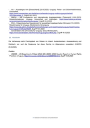 -AA – Auswärtiges Amt [Deutschland] (19.6.2023): Uruguay: Reise- und Sicherheitshinweise, Gesundheit, https://www.auswaertiges-amt.de/de/service/laender/uruguay-node/uruguaysicherheit/ 201138#content_5, Zugriff 19.6.2023 -BMEIA – BM Europäische und internationale Angelegenheiten [Österreich] (19.6.2023): Reiseinformationen, Uruguay, Gesundheit und Impfungen, https://www.bmeia.gv.at/reise- services/reiseinformation/land/uruguay/, Zugriff 19.6.2023 - EDA – Eidgenössisches Departement für auswärtige Angelegenheiten [Schweiz] (13.6.2023): Reisehinweise für Uruguay, Medizinische Versorgung, https://www.eda.admin.ch/eda/de/home/vertretungen-und-reisehinweise/uruguay/reisehinweise- fueruruguay.html#eda246205, Zugriff 13.6.2023 - laenderdaten.info (ohne Datum): Uruguay, Gesundheitssystem, https://www.laenderdaten.info/Amerika/Uruguay/gesundheit.php, Zugriff 16.6.2023 23. Rückkehr Die Verfassung sieht Freizügigkeit von Reisen im Inland, Auslandsreisen, Auswanderung und Rückkehr vor, und die Regierung hat diese Rechte im Allgemeinen respektiert (USDOS 20.3.2023). Quellen: - USDOS – US Department of State [USA] (20.3.2023): 2022 Country Report on Human Rights Practices: Uruguay, https://www.ecoi.net/de/dokument/2089733.html, Zugriff 12.6.2023 .BFA Bundesamt für Fremdenwesen und Asyl Seite 20 von 20