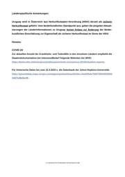 Länderspezifische Anmerkungen: Uruguay wird in Österreich laut Herkunftsstaaten-Verordnung (HStV) derzeit als sicherer Herkunftsstaat geführt. Vom länderkundlichen Standpunkt aus, geben die jüngsten Aktuali- sierungen der Länderinformationen zu Uruguay keinen Anlass zur Änderung der länder- kundlichen Einschätzung zur Eigenschaft als sicherer Herkunftsstaat im Sinne der HStV. Hinweis: COVID-19: Zur aktuellen Anzahl der Krankheits- und Todesfälle in den einzelnen Ländern empfiehlt die Staatendokumentation bei Interesse/Bedarf folgende Websites der WHO: https://www.who.int/emergencies/diseases/novel-coronavirus-2019/situation-reports. Für historische Daten bis zum 10.3.2023 s. die Datenbank der Johns-Hopkins-Universität: https://gisanddata.maps.arcgis.com/apps/opsdashboard/index.html#/bda7594740fd4029942 3467b48e9ecf6 . .BFA Bundesamt für Fremdenwesen und Asyl Seite 3 von 20