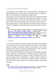 6. Folter und unmenschliche Behandlung Die Verfassung der VAE verbietet Folter und andere grausame, unmenschliche und entwürdigende Bestrafungen und Behandlungen. Es gab jedoch Berichte von Gefangenen in Fällen von Verbrechen gegen die Staatsicherheit, die gefoltert wurden. Scharia-Gerichte, die nach dem islamischen Recht urteilen, können Auspeitschen als Strafe für verschiedene Vergehen verhängen. Das Strafgesetzbuch sieht außerdem vor, dass eine Person Blutgeld („diya“) an die Familie des Opfers bezahlen muss in Fällen, wo ein Unfall oder ein Verbrechen den Tod einer anderen Person verursacht hat (USDOS 13.04.2016). Mehrere Personen gaben an, dass die Regierung sie verschwinden hat lassen und, dass sie während ihrer Haft gefoltert und misshandelt wurden (AI 24.02.2016 vgl. HRW 27.01.2016). Quellen: - AI - Amnesty International (24.02.2016): Amnesty international Report 2015/16 – The State of the World’s Human Rights – United Arab Emirates, https://www.ecoi.net/local_link/319704/466555_de.html, Zugriff 11.08.2016 - HRW – Human Rights Watch (27.01.2016): World Report 2016 – United Arab Emirates, https://www.ecoi.net/local_link/318420/457423_de.html, Zugriff 11.08.2016 - USDOS – US Department of State (13.04.2016): Country Report in Human Rights Practices 2015 – United Arab Emirates, https://www.ecoi.net/local_link/322599/462076_de.html, Zugriff 11.08.2016 7. Korruption Die VAE werden als eines der am wenigsten korrupten Länder im Nahen Osten angesehen und die Regierung hat in den letzten Jahren Schritte unternommen, um die Bürokratie effizienter zu gestalten. Die Vereinigten Arabischen Emirate belegen auf dem Corruption Perception Index aus 2015 von Transparency International Platz 23 von 168. Trotz allem ist die Transparenz in der Regierung generell niedrig (FH 27.01.2016). Das Gesetz sieht Strafen für Korruption vor, welche generell vom Staat effektiv durchgesetzt werden. Es gab jedoch vereinzelte Berichte von staatlicher Korruption. Außerdem gab es häufig Vorfälle von Nepotismus bei der Vergabe von Ämtern und Verträgen. Das Justiz- und das Innenministerium sind für die Bekämpfung von staatlicher Korruption zuständig. Die Regierung unternimmt Schritte zur Bekämpfung von staatlicher Korruption, z.B. wurden im April zwei Polizisten in Dubai verhaftet, weil sie Polizeiberichte gefälscht hatten (USDOS 13.04.2016). Quellen: - FH - Freedom House (27.01.2016): Freedom in the World 2016 – United Arab Emirates, https://www.ecoi.net/local_link/327753/468459_de.html, Zugriff 11.08.2016 .BFA Bundesamt für Fremdenwesen und Asyl Seite 10 von 21
