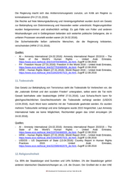 Die Regierung macht sich das Antiterrorismusgesetz zunutze, um Kritik am Regime zu kriminalisieren (FH 27.01.2016). Die Rechte auf freie Meinungsäußerung und Vereinigungsfreiheit wurden durch ein Gesetz zur Bekämpfung von Diskriminierung und Hassreden weiter unterdrückt. Regierungskritiker wurden festgenommen und strafrechtlich verfolgt. Es gab Fälle von Folter und anderen Misshandlungen und in Gefängnissen befanden sich weiterhin politische Gefangene, die in unfairen Prozessen verurteilt worden waren (AI 24.02.2016). Die Sicherheitskräfte ließen zahlreiche Menschen, die die Regierung kritisierten, verschwinden (HRW 27.01.2016). Quellen: - AI – Amnesty International (24.02.2016): Amnesty international Report 2015/16 – The State of the World’s Human Rights – United Arab Emirates, https://www.ecoi.net/local_link/319704/466555_de.html, Zugriff 12.08.2016 - FH - Freedom House (27.01.2016): Freedom in the World 2016 – United Arab Emirates, https://www.ecoi.net/local_link/327753/468459_de.html, Zugriff 12.08.2016 - HRW – Human Rights Watch (27.01.2016): World Report 2016 – United Arab Emirates, https://www.ecoi.net/local_link/318420/457423_de.html, Zugriff 12.08.2016 11.Todesstrafe Das Gesetz zur Bekämpfung von Terrorismus sieht die Todesstrafe für Verbrechen vor, die die „nationale Einheit und den sozialen Frieden“ untergraben, selbst wenn die Tat nicht Gewalt beinhaltete oder beabsichtigte (HRW 27.01.2016). Laut Scharia-Recht kann für gleichgeschlechtlichen Geschlechtsverkehr die Todesstrafe verhängt werden (USDOS 13.04.2016). Auch Mord kann weiterhin mit der Todesstrafe geahndet werden. Es wurden mehrere Todesurteile verhängt und eine Gefangene wurde 2015 hingerichtet. Laut Amnesty International hatte sie keine Möglichkeit, Rechtsmittel gegen das Urteil einzulegen (AI 24.02.2016). Quellen: - AI - Amnesty International (24.02.2016): Amnesty international Report 2015/16 – The State of the World’s Human Rights – United Arab Emirates, https://www.ecoi.net/local_link/319704/466555_de.html, Zugriff 12.08.2016 - HRW – Human Rights Watch (27.01.2016): World Report 2016 – United Arab Emirates, https://www.ecoi.net/local_link/318420/457423_de.html, Zugriff 12.08.2016 - USDOS – US Department of State (13.04.2016): Country Report in Human Rights Practices 2015 – United Arab Emirates, https://www.ecoi.net/local_link/322599/462076_de.html, Zugriff 12.08.2016 12.Religionsfreiheit Ca. 85% der Staatsbürger sind Sunniten und 14% Schiiten. 1% der Staatsbürger gehört anderen islamischen Glaubensrichtungen an, z.B. die Drusen. Der Großteil der in den VAE .BFA Bundesamt für Fremdenwesen und Asyl Seite 13 von 21