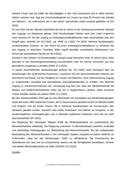 Obwohl Frauen fast die Hälfte der Beschäftigten in den USA ausmachen und in vielen Berufen stärker vertreten sind, liegt das Durchschnittsgehalt von Frauen bei etwa 83 Prozent des Gehalts von Männern - ein Unterschied, der in den letzten Jahrzehnten relativ konstant geblieben ist (FH 2023). Im Juni 2022 hat der Oberste Gerichtshof die seit 50 Jahren in der Verfassung verankerte Garantie des Zugangs zur Abtreibung gekippt. Viele Bundesstaaten führten nach dem Urteil umgehend neue Gesetze ein, die den Zugang zu Schwangerschaftsabbrüchen stark einschränkten oder den Eingriff ganz verboten (AI 28.3.2023; vgl. HRW 12.1.2023, FH 2023). Mehrere Bundesstaaten verabschiedeten Gesetze, um das Recht auf einen Schwangerschaftsabbruch zu schützen und den Zugang zu erleichtern. Präsident Biden ergriff ebenfalls verschiedene Maßnahmen zum Schutz der reproduktiven Rechte (AI 28.3.2023). Gesetze in den meisten US-Bundesstaaten zwingen junge Menschen unter 18 Jahren dazu, einen Elternteil in ihre Abtreibungsentscheidung einzubeziehen oder ein Gericht anzurufen, um eine gerichtliche Umgehung zu erhalten (HRW 12.1.2023). In seinen Abschließenden Beobachtungen äußerte der UN CERD seine Besorgnis über die Auswirkungen des systemischen Rassismus, zusammen mit sich überschneidenden Faktoren wie Geschlecht und Rasse, auf die Fähigkeit von Frauen und Mädchen, ohne Diskriminierung Zugang zu umfassenden sexuellen und reproduktiven Gesundheitsdiensten zu erhalten. Der fehlende Zugang zu Krankenversicherung und -versorgung trug dazu bei, dass die Sterblichkeitsrate bei Müttern und Gebärmutterhalskrebs höher war als in vergleichbaren Ländern, wobei schwarze Frauen häufiger starben als andere (HRW 12.1.2023). Bei den Zwischenwahlen 2022 gab es eine Rekordzahl von Kandidaten aus Minderheitengruppen sowie die ersten offen lesbischen Frauen, die zu Gouverneuren gewählt wurden (in Massachusetts und Oregon), und die ersten Frauen, die in mehreren Bundesstaaten als Gouverneurin oder Senatorin gewählt wurden. Dennoch sind weiße Amerikaner und Männer im Kongress, in den bundesstaatlichen Gesetzgebungen und in leitenden politischen Positionen nach wie vor stark überrepräsentiert (FH 2023). Die Regierung der Vereinigten Staaten erfüllt die Mindeststandards zur Unterbindung des Menschenhandels vollständig. Die Regierung unternahm im Berichtszeitraum weiterhin ernsthafte und nachhaltige Anstrengungen zur Bekämpfung des Menschenhandels. Bei der umfassenden Bekämpfung des Menschenhandels in den Vereinigten Staaten mangelte es jedoch weiterhin an Fortschritten, etwa bei den Bemühungen, Opfer zu identifizieren. Die Finanzierung der Opferdienste war nach wie vor unzureichend, ebenso wie die Verfügbarkeit bezahlbarer, sicherer und stabiler Wohnmöglichkeiten für Opfer (USDOS 15.6.2023). Quellen: .BFA Bundesamt für Fremdenwesen und Asyl Seite 19 von 27