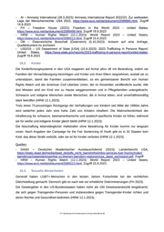 - AI – Amnesty International (28.3.2023): Amnesty International Report 2022/23; Zur weltweiten Lage der Menschenrechte; USA 2022, https://www.ecoi.net/de/dokument/2089665.html, Zugriff 15.9.2023 - FH – Freedom House (2023): Freedom in the World 2023 - United States, https://www.ecoi.net/de/dokument/2088499.html, Zugriff 18.9.2023 -HRW – Human Rights Watch (12.1.2023): World Report 2023 – United States, https://www.ecoi.net/de/dokument/2085513.html, Zugriff 15.9.2023 -ÖB – Österreichiche Botschaft [Österreich] (5.10.2023): Antwort auf eine Anfrage, Quelldokument ho archiviert -USDOS – US Department of State [USA] (15.6.2023): 2023 Trafficking in Persons Report: United States, https://www.state.gov/reports/2023-trafficking-in-persons-report/united-states, Zugriff 19.9.2023 18.2. Kinder Die Kinderfürsorgesysteme in den USA reagieren auf Armut allzu oft mit Bestrafung, indem sie Familien der Vernachlässigung bezichtigen und Kinder von ihren Eltern wegnehmen, anstatt sie zu unterstützen, damit die Familien zusammenbleiben, so ein gemeinsamer Bericht von Human Rights Watch und der American Civil Liberties Union, der im November veröffentlicht wurde. Alle drei Minuten wird ein Kind von zu Hause weggenommen und in Pflegefamilien untergebracht. Schwarze und indigene Menschen sowie Menschen, die in Armut leben, sind unverhältnismäßig stark betroffen (HRW 12.1.2023). Trotz eines 73-prozentigen Rückgangs der Verhaftungen von Kindern seit Mitte der 1990er-Jahre wird weiterhin jedes Jahr eine hohe Zahl von Kindern inhaftiert. Die Wahrscheinlichkeit der Inhaftierung für schwarze, lateinamerikanische und asiatisch-pazifische Kinder ist höher, während sie für weiße und indigene Kinder gleich bleibt (HRW 12.1.2023). Die Abschaffung lebenslänglicher Haftstrafen ohne Bewährung für Kinder kommt nur langsam voran. Nach Angaben der Campaign for the Fair Sentencing of Youth gibt es in 32 Staaten kein Kind, das diese Strafe verbüßt, oder sie ist für Kinder verboten (HRW 12.1.2023). Quellen: -DAAD – Deutscher Akademischer Ausstauschdienst (2023): Länderbericht USA, https://static.daad.de/media/daad_de/pdfs_nicht_barrierefrei/infos-services-fuer-hochschulen/ laendersachstaende/expertise-zu-themen-laendern-regionen/usa_daad_sachstand.pdf, Zugriff -HRW – Human Rights Watch (12.1.2023): World Report 2023 – United States, https://www.ecoi.net/de/dokument/2085513.html, Zugriff 15.9.2023 18.3. Sexuelle Minderheiten Generell haben LGBT+-Menschen in den letzten Jahren Fortschritte bei der rechtlichen Gleichstellung gemacht. Dennoch gibt es nach wie vor erhebliche Diskriminierungen (FH 2023). Die Gesetzgeber in den US-Bundesstaaten haben mehr als 150 Gesetzesentwürfe eingebracht, die sich gegen Transgender-Personen und insbesondere gegen Transgender-Kinder richten und deren Rechte und Gesundheit bedrohen (HRW 12.1.2023). .BFA Bundesamt für Fremdenwesen und Asyl Seite 20 von 27