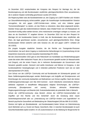 Im Dezember 2022 verabschiedete der Kongress den Respect for Marriage Act, der die Bundesregierung und alle Bundesstaaten verpflichtet, gleichgeschlechtliche Ehen anzuerkennen, die in anderen Staaten rechtmäßig geschlossen wurden (FH 2023). Die Regierung Biden wies die Bundesbehörden an, den Zugang von LGBTI-Familien und -Kindern zur Gesundheitsversorgung sicherzustellen, gegen die Auswirkungen bundesstaatlicher Gesetze vorzugehen, die sich gegen LGBTI-Schüler:innen richten, und eine Initiative gegen "Konversionstherapien" zu starten, um das Risiko zu reduzieren, dass diese angewandt werden. Darüber hinaus gab das Außenministerium bekannt, dass Inhaber*innen von US-Reisepässen ihr Geschlecht künftig selbst wählen können, ohne medizinische Unterlagen vorlegen zu müssen, und dass sie als Geschlecht "X" angeben können. Im Dezember 2022 trat mit dem Respect for Marriage Act ein bundesweites Gesetz in Kraft, das die Bundesstaaten dazu verpflichtet, alle Ehen, die legal geschlossen wurden, anzuerkennen, auch gleichgeschlechtliche Ehen. Einige Bundesstaaten führten weiterhin sehr viele Gesetze ein, die sich gegen LGBTI+ richteten (AI 28.3.2023). Die jüngste Ausgabe staatlicher Gesetze, die die Rechte von Transgender-Personen einschränken, hat auch deren Zugang zu medizinischen Behandlungen im Zusammenhang mit der körperlichen Autonomie und dem Aussehen beeinträchtigt (FH 2023). Bei den Zwischenwahlen 2022 gab es eine Rekordzahl von Kandidaten aus Minderheitengruppen sowie die ersten offen lesbischen Frauen, die zu Gouverneuren gewählt wurden (in Massachusetts und Oregon), und die ersten Frauen, die in mehreren Bundesstaaten als Gouverneurin oder Senatorin gewählt wurden. Dennoch sind weiße Amerikaner und Männer im Kongress, in den bundesstaatlichen Gesetzgebungen und in leitenden politischen Positionen nach wie vor stark überrepräsentiert (FH 2023). Zum Schutz von der LGBTQI+ Community wird auf Bundesseite ein Schwerpunkt gesetzt: auf Basis Gefährdungseinschätzungen werden Bedrohungen und Aufgriffe auf Einzelpersonen und Einrichtungen der community beobachtet und Maßnahmen zum Schutz ergriffen: Nach den letzten Gefährdungseinschätzungen vom Mai 2023 kommen - durch inländische extremistische Akteure (teilweise organisiert in bewaffneten Milizgruppen) religiöse Einrichtungen, die LGBTQI+- community (Einzelpersonen und events), Schulen, ethnische Minderheiten, Regierungseinrichtungen und Beamte (inkl. Exekutivbedienstete) als potentielle Ziele in Betracht. Schutz der LGBTQI+community: etwa Bereich „Schutz der LGBTQI+-Gemeinschaften vor Angriffen auf ihre Rechte und ihre Sicherheit“ durch die Gründung einer neuen Sicherheitspartnerschaft oder zur „Unterstützung von LGBTQI+-Kindern und Jugendlichen“ im Bereich psychische Gesundheit und Bekämpfung der Obdachlosigkeit (VB des BMI 20.10.2023). Diverse civil rights act (Bundesebende und Bundesstaaten) bieten Schutz vor Diskriminierung durch Behörden auf u.a. Grund von Rasse, Geschlecht, Alter; in manchen Bundesstaaten ist auch Geschlechtsidentität explizit erwähnt. Im US-Justizministerium ist die Abteilung für Bürgerrechte für .BFA Bundesamt für Fremdenwesen und Asyl Seite 21 von 27