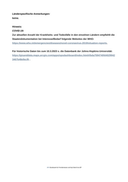 Länderspezifische Anmerkungen: keine. Hinweis: COVID-19: Zur aktuellen Anzahl der Krankheits- und Todesfälle in den einzelnen Ländern empfiehlt die Staatendokumentation bei Interesse/Bedarf folgende Websites der WHO: https://www.who.int/emergencies/diseases/novel-coronavirus-2019/situation-reports. Für historische Daten bis zum 10.3.2023 s. die Datenbank der Johns-Hopkins-Universität: https://gisanddata.maps.arcgis.com/apps/opsdashboard/index.html#/bda7594740fd4029942 3467b48e9ecf6 . .BFA Bundesamt für Fremdenwesen und Asyl Seite 3 von 27