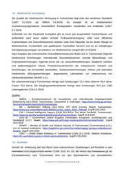 14. Medizinische Versorgung Die Qualität der medizinischen Versorgung in Turkmenistan liegt unter den westlichen Standards (USET 8.2.2024; vgl. BMEIA 5.6.2024). Es mangelt oft an medizinischem Grundversorgungsmaterial, einschließlich Einwegnadeln, Anästhetika und Antibiotika (USET 8.2.2024). Außerhalb von der Hauptstadt Aschgabat gibt es kaum gut ausgestattete Krankenhäuser und größtenteils auch keine stabile zentrale Trinkwasserversorgung. Viele neue öffentliche Krankenhäuser und Gesundheitszentren arbeiten unter ihrer Kapazität, da ein akuter Mangel an Medizintechnik, Arzneimitteln und qualifizierten Fachkräften herrscht und es an mehrjährigen Dienstleistungsverträgen mit Anbietern von Medizintechnik mangelt (BS 19.3.2024). Nach Angaben des turkmenischen Gesundheitsministeriums finden sich in Turkmenistan folgende medizinische Einrichtungen: Internationale Gesundheitszentren, zentrale Behandlungs- und Prophylaxeeinrichtungen, regionale Büros wie z.B. Gesundheitsabteilungen, Staatlicher sanitärer und epidemiologischer Dienst, Produktionsunternehmen der medizinischen Industrie und Einrichtungen, die Arzneimittel bereitstellen, Sanatoriumseinrichtungen, höhere und sekundäre medizinische Bildungseinrichtungen, diagnostische Laboratorien zur Untersuchung von Infektionskrankheiten (MHMIT o.D.) Die Lebenserwartung in Turkmenistan beträgt nach Schätzungen 72,4 Jahre (Männer 69,4 Jahre; Frauen 75,5 Jahre). Die Säuglingssterblichkeitsrate beträgt nach Schätzungen 35,9 pro 1.000 Lebensgeburten (CIA 6.6.2024). Quellen: - BMEIA – Bundesministerium für europäische und internationale Angelegenheiten [Österreich] (19.6.2024): Turkmenistan, Gesundheit & Impfungen, https://www.bmeia.gv.at/reise- services/reiseinformation/land/turkmenistan, - BS – Bertelsmann Stiftung (19.3.2024): BTI 2024 Country Report Turkmenistan, https://www.ecoi.net/en/file/local/2105842/country_report_2024_TKM.pdf, Zugriff 19.6.2024 - CIA – Central Intelligence Agency [USA] (6.6.2024): The World Factbook: Turkmenistan, https://www.cia.gov/the-world-factbook/countries/turkmenistan/, Zugriff 19.6.2024 - GOV.UK – Government United Kingdom [Vereinigtes Königreich Großbritannien und Nordirland] (o.D.): Health, https://www.gov.uk/foreign-travel-advice/turkmenistan/health, Zugriff 19.6.2024 - MHMIT – Ministry of Health and Medical Industry of Turkmenistan [Turkmenistan] (o.D.): List of medical institutions, https://saglykhm.gov.tm/en/hyzmatlar/saglygy-gorayys-edaralarynyn- sanawy, Zugriff 19.6.2024 - USET – United States Embassy in Turkmenistan [USA] (8.2.2024): Medical Assistance, https://tm.usembassy.gov/u-s-citizen-services/doctors/, Zugriff 19.6.2024 15. Rückkehr Gemäß der Verfassung darf das Recht eines turkmenischen Staatsbürgers auf Rückkehr in sein Heimatland nicht eingeschränkt werden (TURK 2016, Art. 10). Bei Verlust des Reisepasses gilt als Einreisedokument nach Turkmenistan eine von den diplomatischen und konsularischen .BFA Bundesamt für Fremdenwesen und Asyl Seite 21 von 22