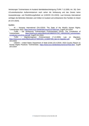 Vertretungen Turkmenistans im Ausland Identitätsbescheinigung (TURK 7.12.2005, Art. 30). Dem US-amerikanischen Außenministerium nach sehen die Verfassung und das Gesetz keine Auswanderungs- und Rückführungsfreiheit vor (USDOS 23.4.2024). Laut Amnesty International verfolgen die Behörden Aktivisten und Kritiker im Ausland und schikanieren ihre Familien im Inland (AI 24.4.2024). Quellen: - AI – Amnesty International (24.4.2024): The State of the World's Human Rights; Turkmenistan 2023, https://www.ecoi.net/de/dokument/2107938.html, Zugriff 19.6.2024 - TURK – Die Verfassung Turkmenistans [Turkmenistan] (2016): The Constitution of Turkmenistan, https://www.ecoi.net/en/file/local/1086053/1226_1484303330_turkmenistan- constitution-am2016-eng.pdf, Zugriff 19.6.2024 - TURK – Migrationsgesetz [Turkmenistan] (7.12.2005): Law on Migration, https://www.ecoi.net/en/file/local/1137393/1504_1218007283_law-on-migration.pdf, Zugriff 19.6.2024 - USDOS – United States Department of State [USA] (23.4.2024): 2023 Country Report on Human Rights Practices: Turkmenistan, https://www.ecoi.net/de/dokument/2107632.html, Zugriff 19.6.2024 .BFA Bundesamt für Fremdenwesen und Asyl Seite 22 von 22